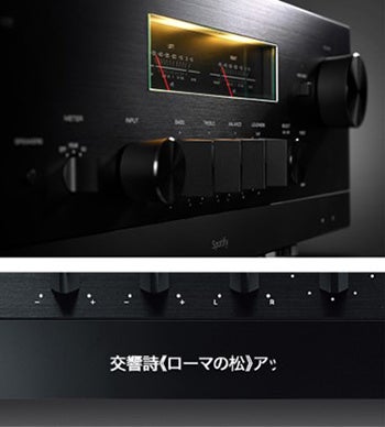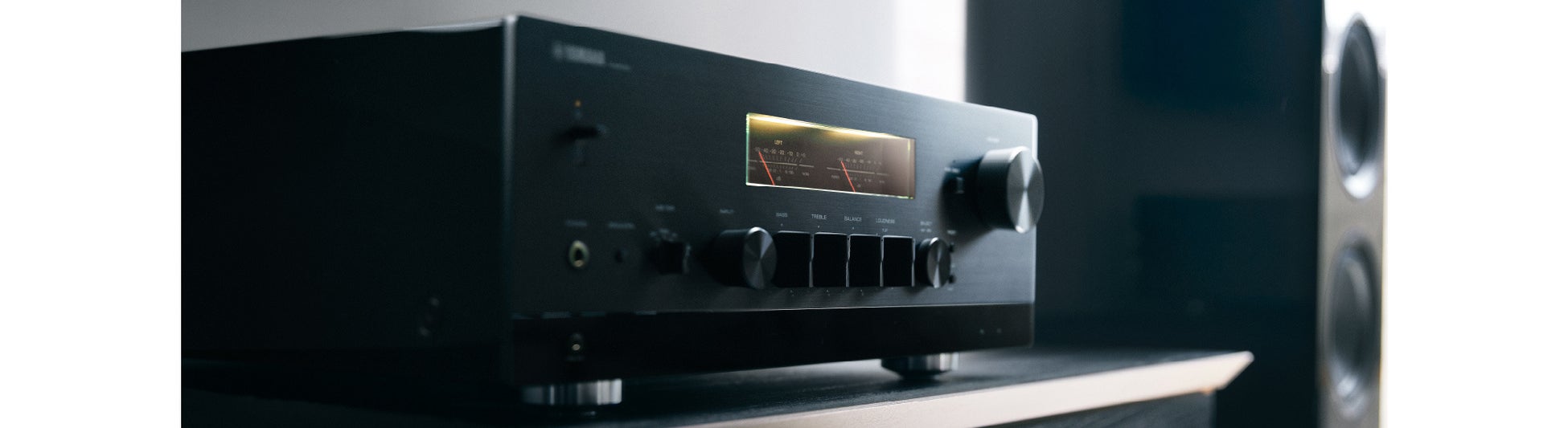 上質なヘアライン仕上げのアルミフロントパネルに加え、サイドパネルにはヤマハのピアノと同じ塗装・研磨工程を経て製作されるピアノブラック仕上げを採用し、ヤマハのHiFiオーディオならではのシンプルかつ洗練されたデザインを継承しました。さらにVU/ピークの切り替え表示とディマー(減光)が可能な高精度レベルメーターを装備しています。柔らかな雰囲気を意識したランプ色のLEDライトがメーターの動きを美しく演出し、音楽を聴く楽しみをさらに高めます。また本体の下部には、入力コンテンツや操作時のボリューム表示などの情報を見やすく高品位に表示する有機ELディスプレイを搭載しました。