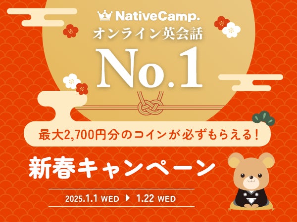 ネイティブスピーカーと回数無制限のオンライン英会話サービス「ネイティブキャンプ英会話」を展開する株式会社ネイティブキャンプ(東京都渋谷区 代表取締役:谷川国洋)は「新春キャンペーン」として、最大2,700円分のコインが必ずもらえる新春特別3大イベントを開催いたします。