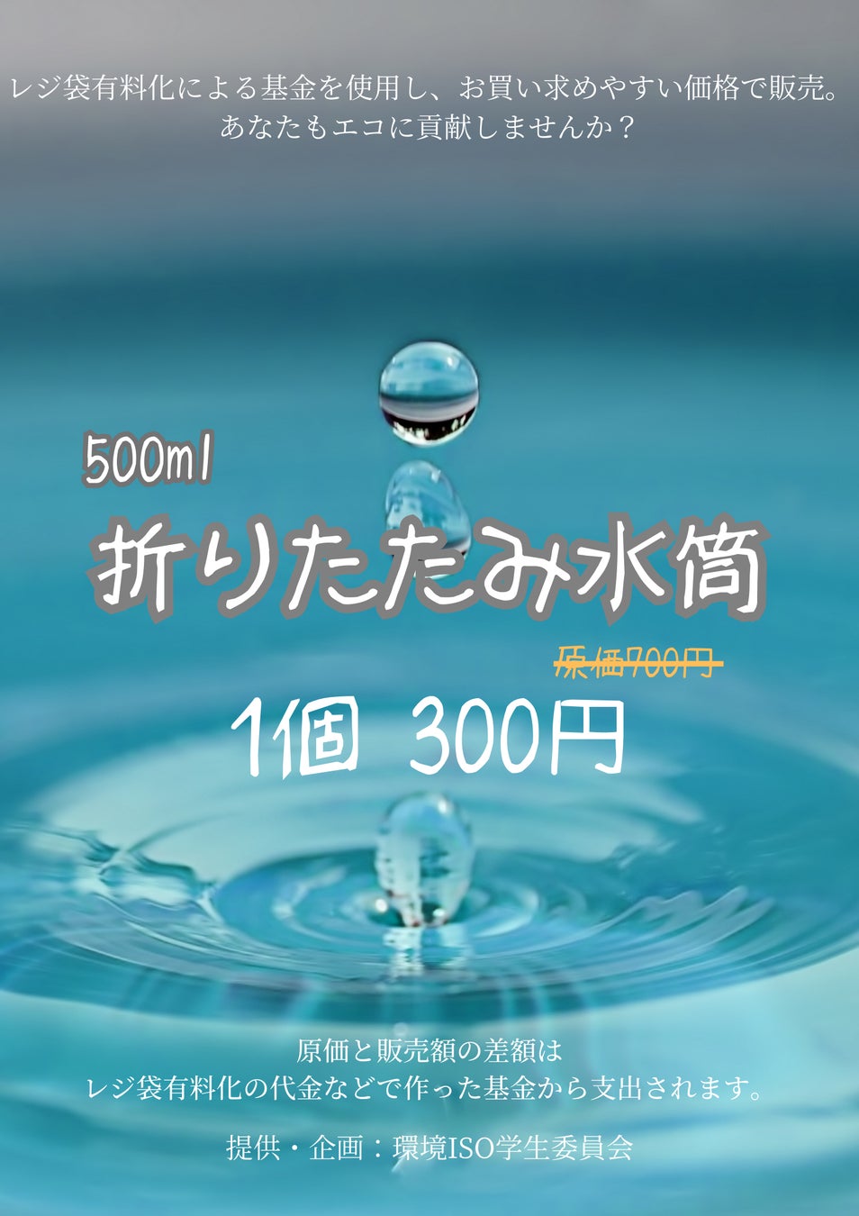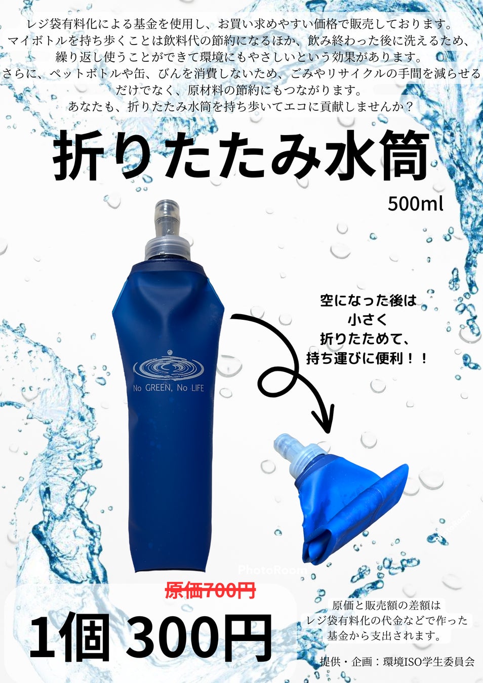 目的:マイボトルを持ち歩くことは飲料代の節約になるほか、飲み終わった後に洗って繰り返し使えるため、環境にやさしいという効果があります。また、ペットボトルやビン、カンを消費しないことで、ゴミの削減だけでなく、リサイクルに必要なエネルギーや原材料の節約に貢献するため、持続可能な社会の実現を目指す一環として、「折りたたみ水筒」の販売により学内の教職員や学生に対して環境意識を啓発し、日常生活における使い捨て容器の削減を目指します。