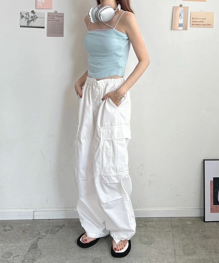 2wayのダブルストラップとチュール使いがおしゃれなサマーニットのリブキャミ。白のカーゴパンツとコンフォートサンダルで颯爽と。