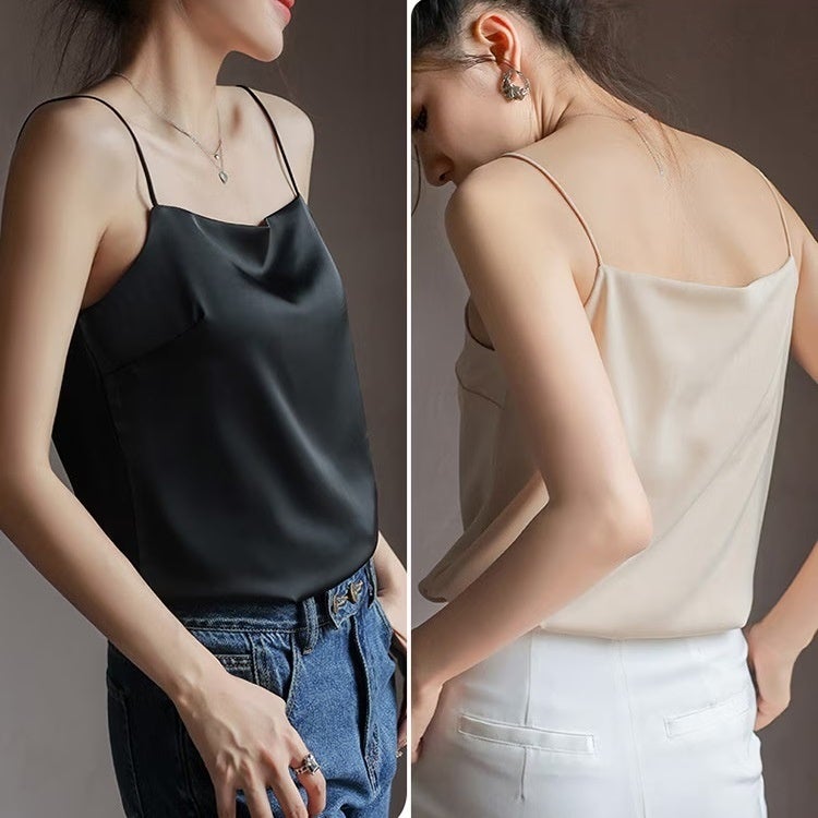 通気性と光沢感のあるアイスシルク地に華奢な肩紐のデザインがエレガントなブラキャミソール。ラウンドネックとVネックの2種展開。