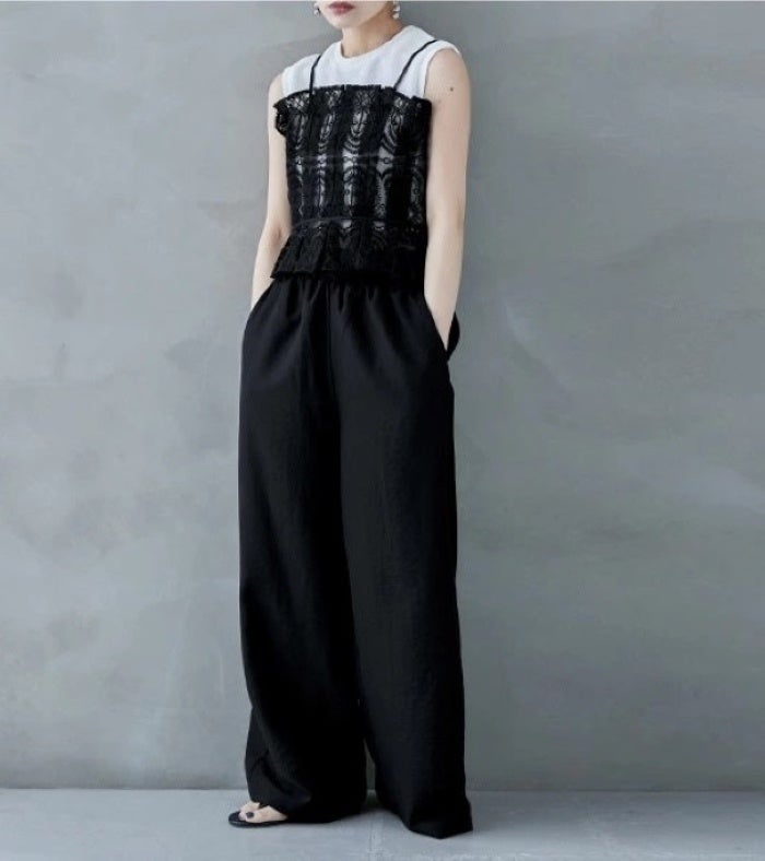 レースとタックプリーツがリュクスな印象で、バックリボンが愛らしいビスチェ。トレンドの“重ね着キャミ”&マニッシュなパンツで甘辛コーデに。