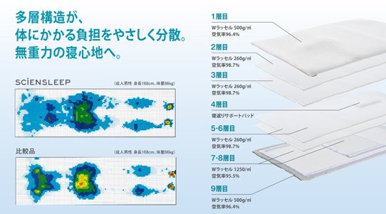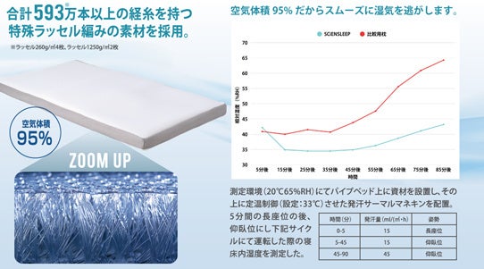 空気体積比率95%の空気層と、593万以上の経糸(たていと)を持つため、やわらかいのに弾力性のあるふわふわな寝心地と快適な寝返りを打てる適度な反発を実現しました。