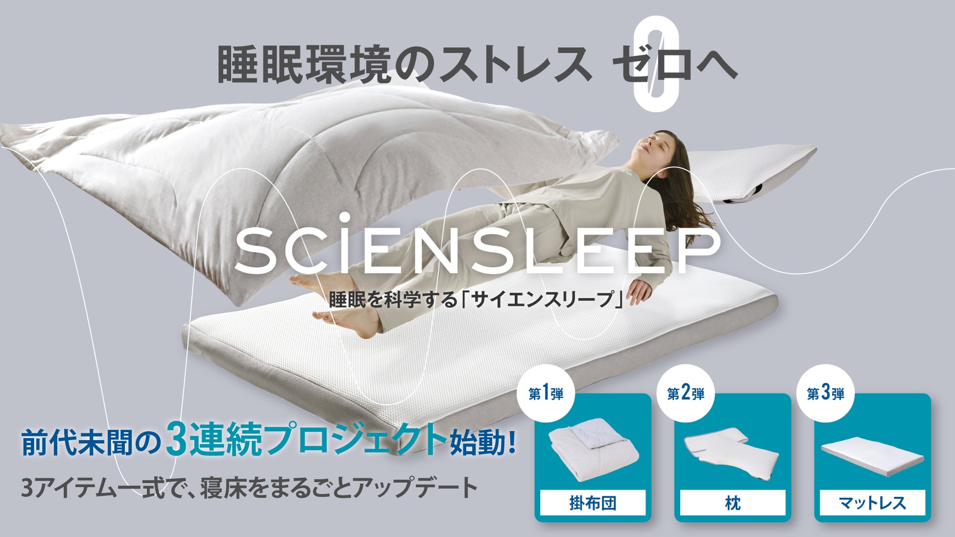Makuakeでグッドプロジェクトに認定された疲労軽減ウェア「SCiENSLEEP(サイエンスリープ)」を手掛けるSEESAYが新たに発売する寝具シリーズは、第1弾の調温2WAY掛布団を皮切りに、第2弾の多層構造の枕、第3弾の体圧を分散するマットレスの3アイテムです。睡眠改善インストラクターが監修する眠りの環境を整える寝具シリーズを是非ご体感下さい。