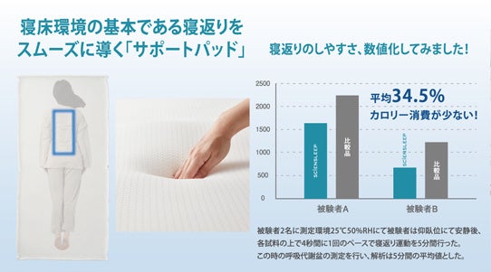 サポートパッドは特殊ラッセル編みのやわらかなポリエステル素材を採用。繰り返す寝返りを妨げず、スムーズに導きます。