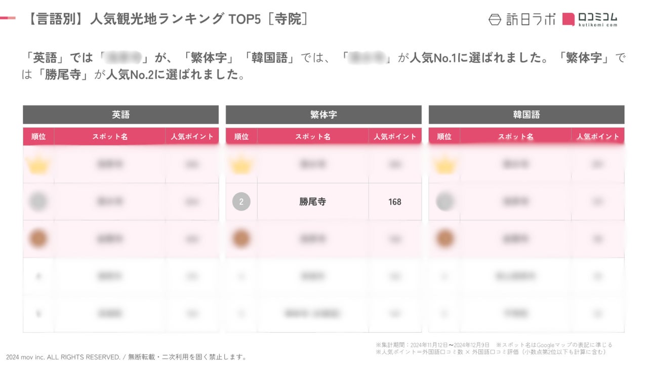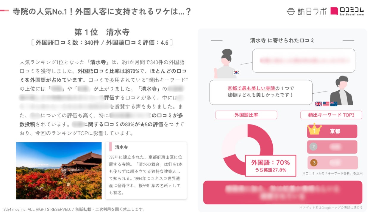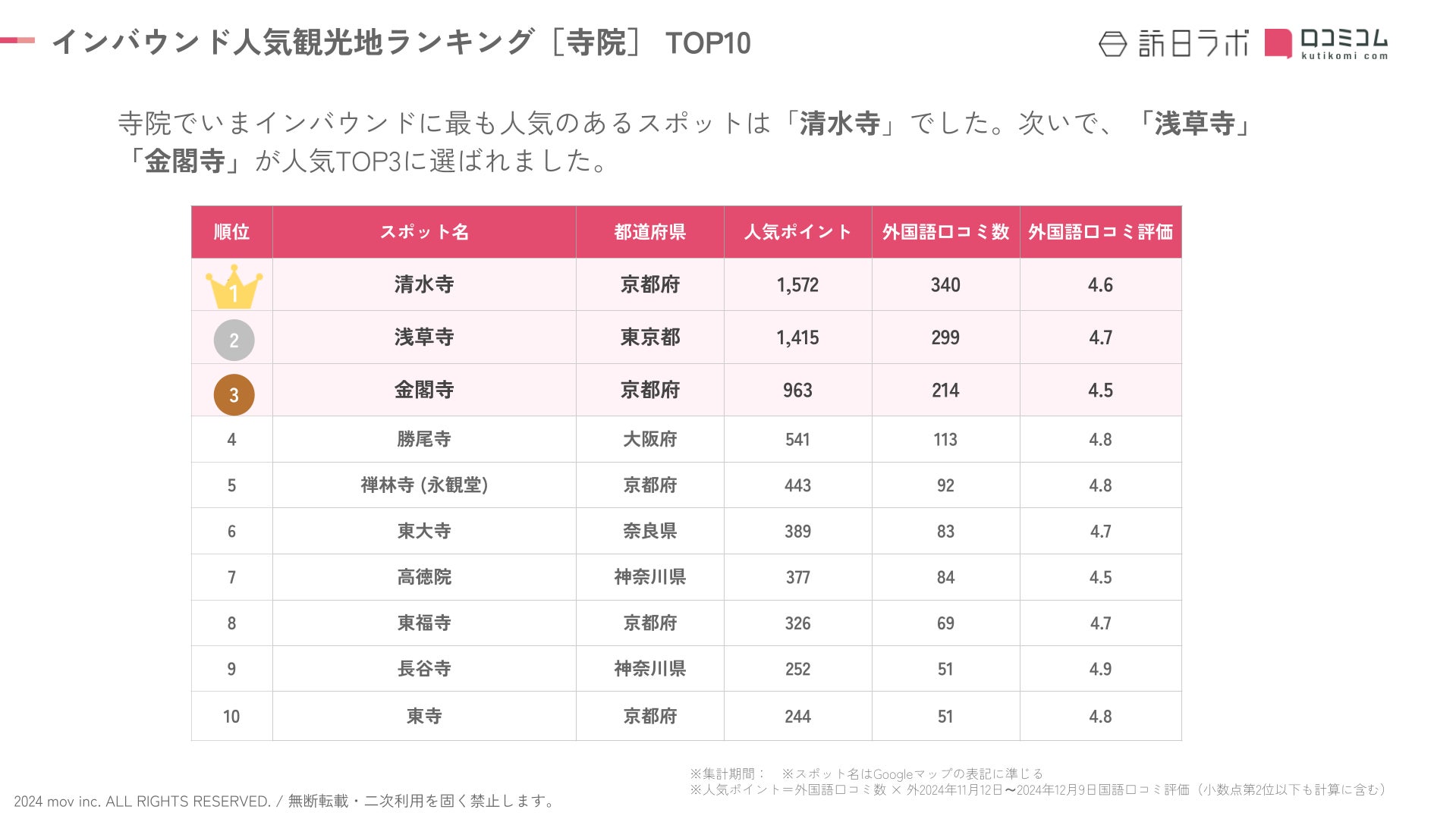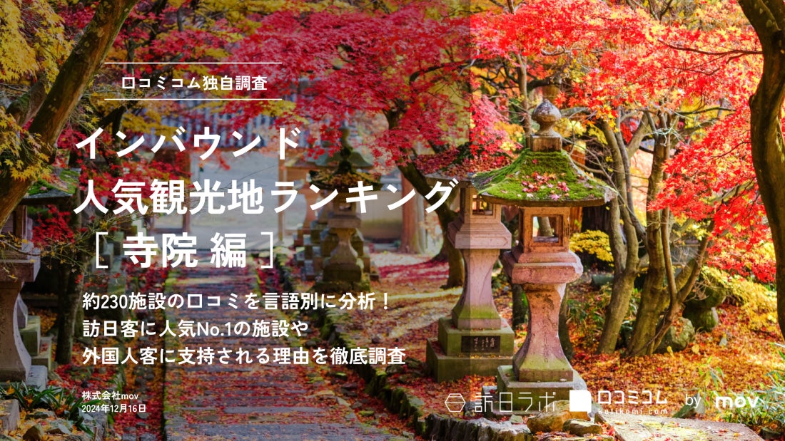 業界最大級のインバウンドビジネスメディア「訪日ラボ」及び 店舗向け集客一元化プラットフォーム「口コミコム」を運営する株式会社mov(代表取締役:渡邊 誠、本社:東京都渋谷区、以下mov)は、国内の寺院に寄せられた最新の口コミデータから、独自の『インバウンド人気観光地ランキング』を発表しました。