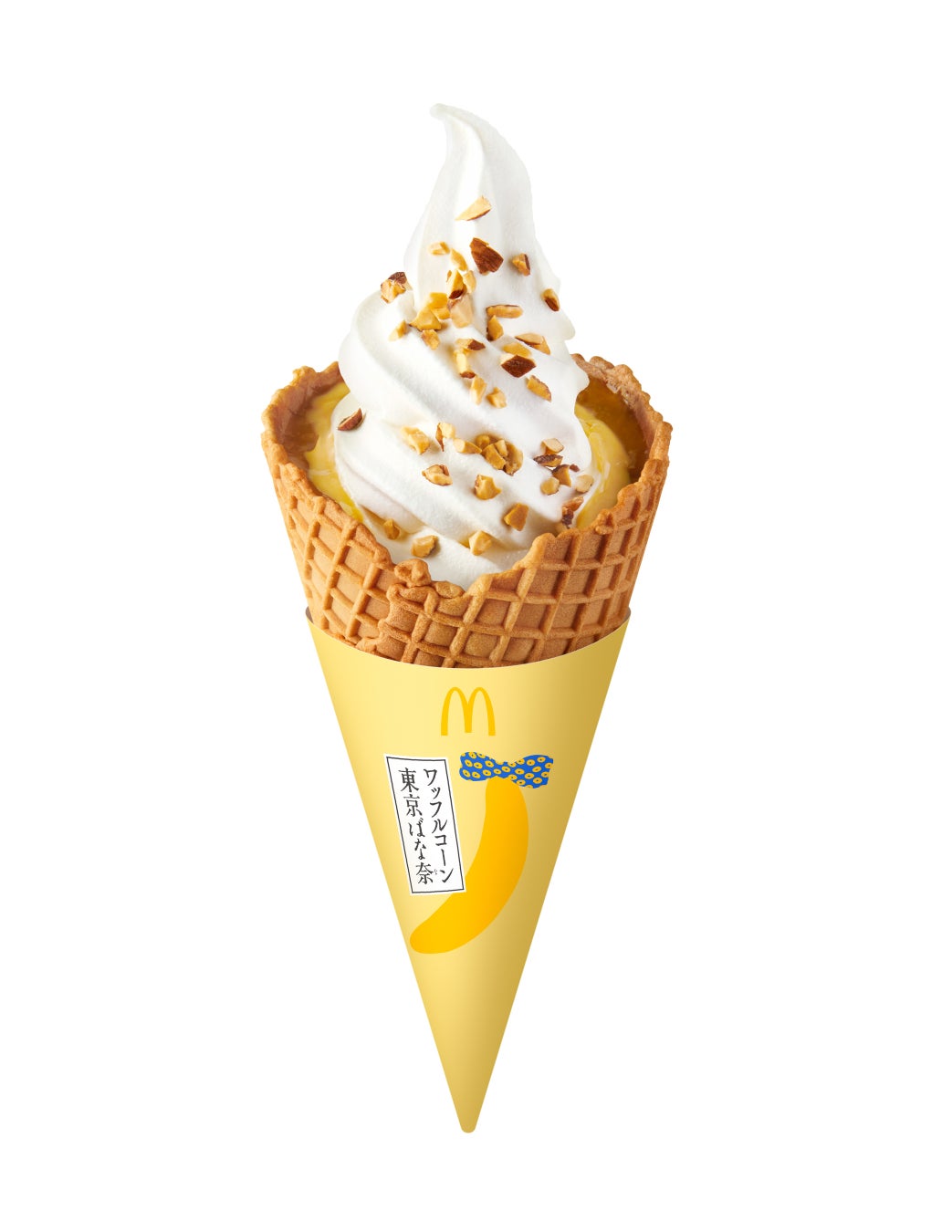 「ワッフルコーン 東京ばな奈」は、サクサク食感のワッフルコーンとミルクリッチなソフトクリームに、「東京ばな奈」監修の自然な甘みとカスタードのコクのバランスにこだわった芳醇なバナナカスタードソースとアーモンドをプラスしました。マクドナルドオリジナルデザインの数量限定パッケージでご提供いたします。今しか食べられない特別な味わいをぜひお楽しみください。