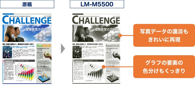従来のエプソンのスマートチャージ対応モデル同様、圧倒的な低消費電力設計で、CO2の排出量を抑え、お客様の環境負荷低減を後押しします。『LM-M5500』は、高速プリントかつモノクロでも高画質な印字品質の実現で、官公庁や金融機関など、モノクロ印刷ニーズが高いお客様の業務効率化に貢献します。