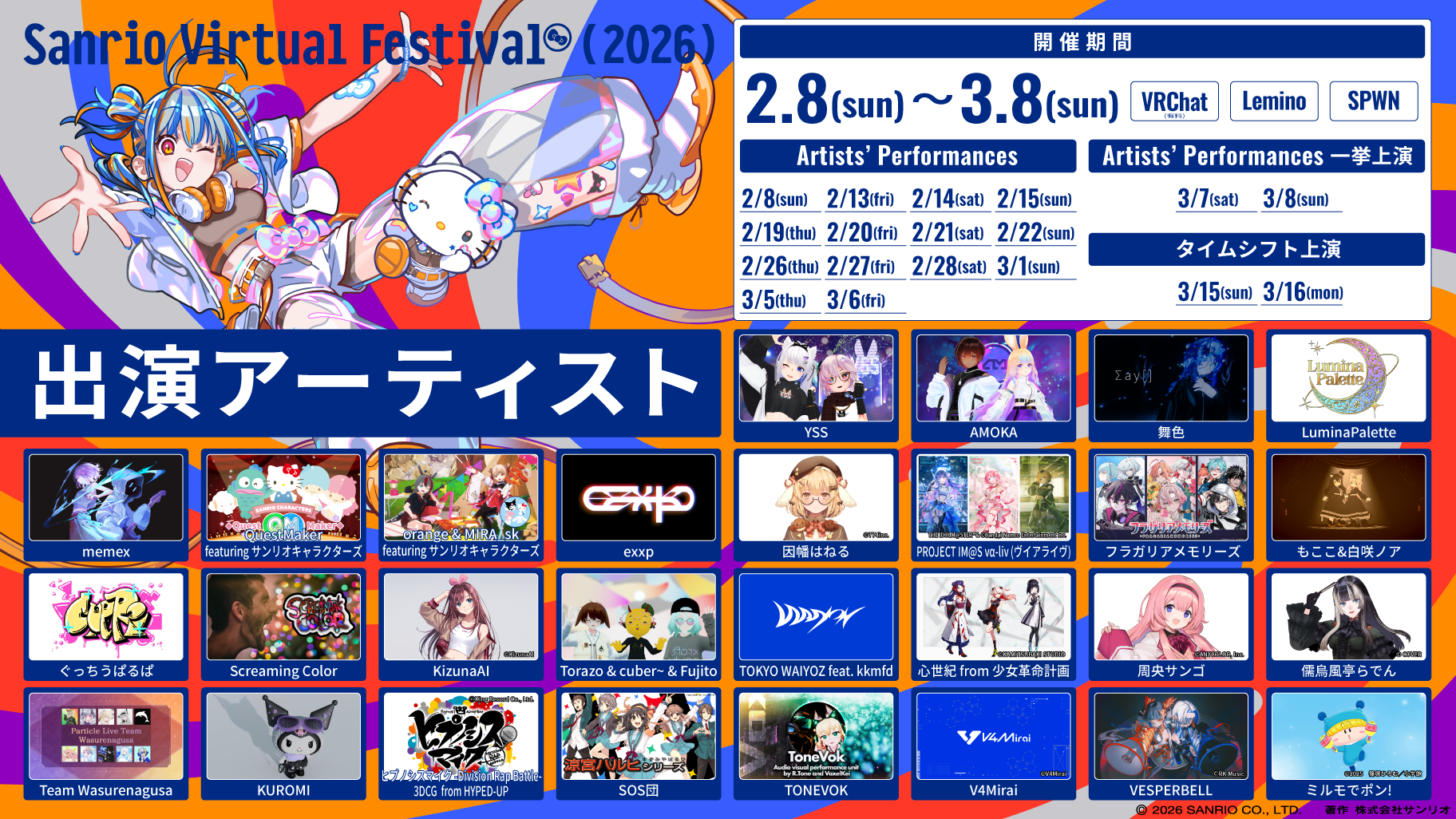 株式会社サンリオ(本社:東京都品川区、社長:辻󠄀 朋邦、以下サンリオ) は、2026年2月8日(日)から3月8日(日)にかけ、毎年好評のVR音楽フェスベント「Sanrio Virtual Festival 2026」を開催し、本イベントに出演するアーティスト全28組が決定したことをお知らせします。