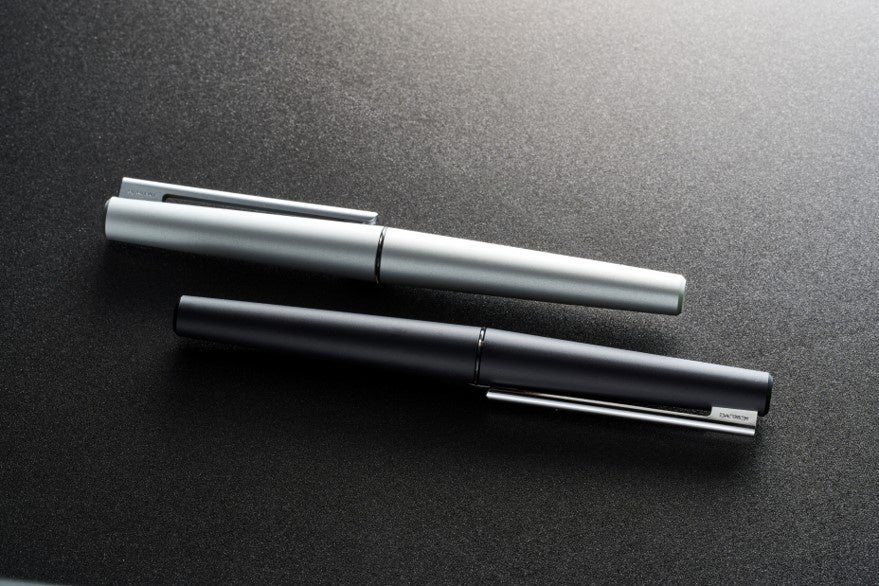 キャップと本体軸はアルミ無垢材から切り出たシャープなエッジのある形状に加え、ブラスト加工とアルマイト処理による上品なマット仕上げとしました。さらにクリップの端面もそれに調和するようなエッジが際立ったデザインを採用しています。