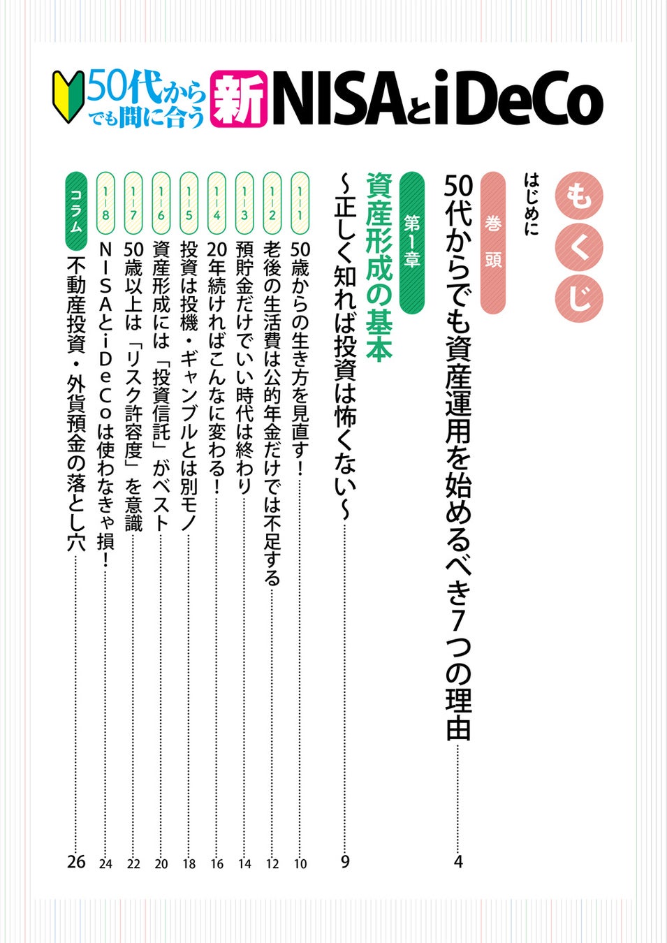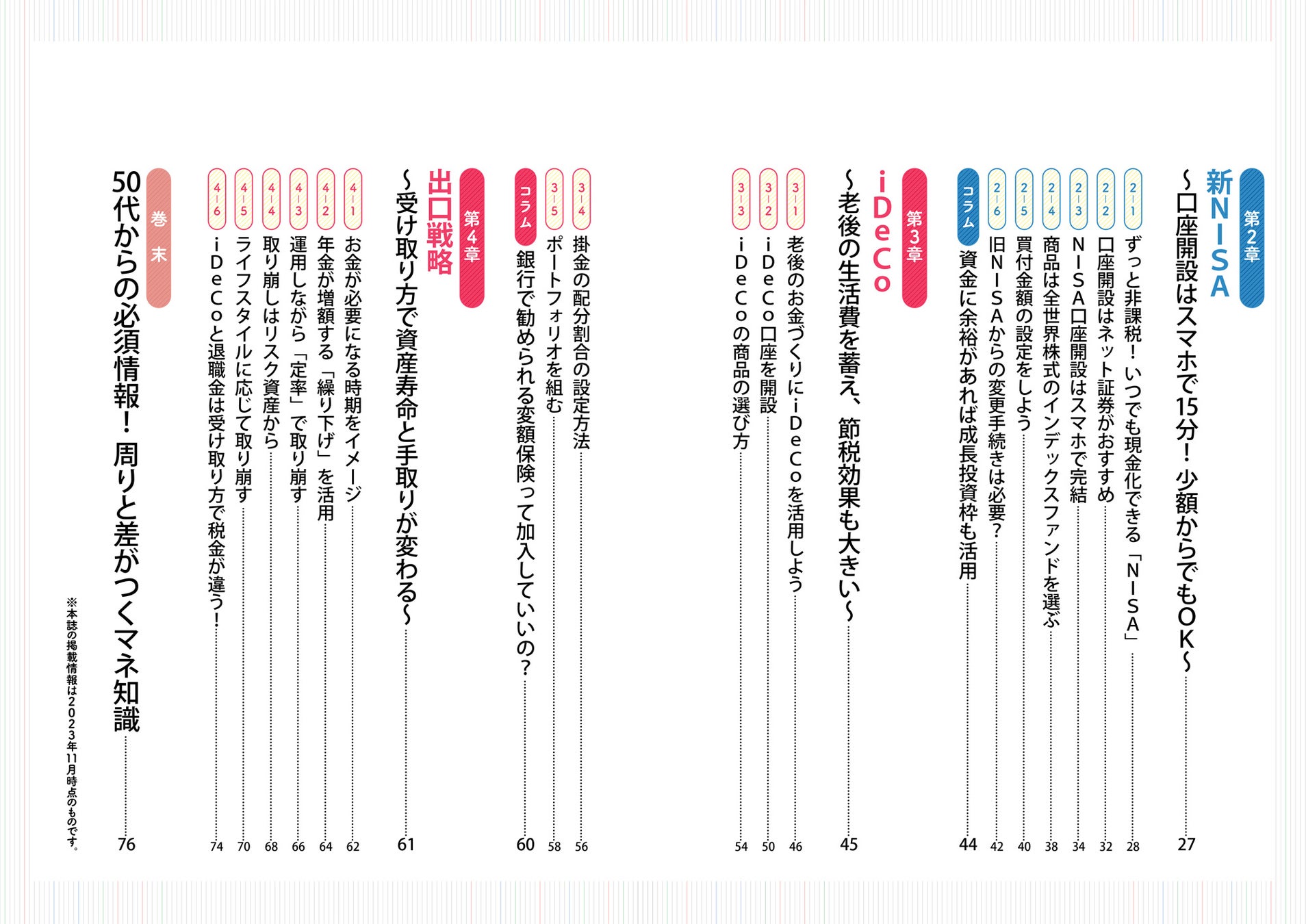 本書は、2024年1月からパワーアップする新NISAとiDeCoを最大限に活用する、初心者向けのガイドです。この歳になって投資をはじめても遅いのでは? と思っている方に、50代からでも投資をはじめるべき理由、投資の基本、新NISAとiDeCoの仕組み、つまずかない口座開設や商品選びをやさしく解説。さらに、老後の生活が視野に入る50代以上に必須の知識として「出口戦略=資産の取り崩し方」も丁寧に紹介しています。