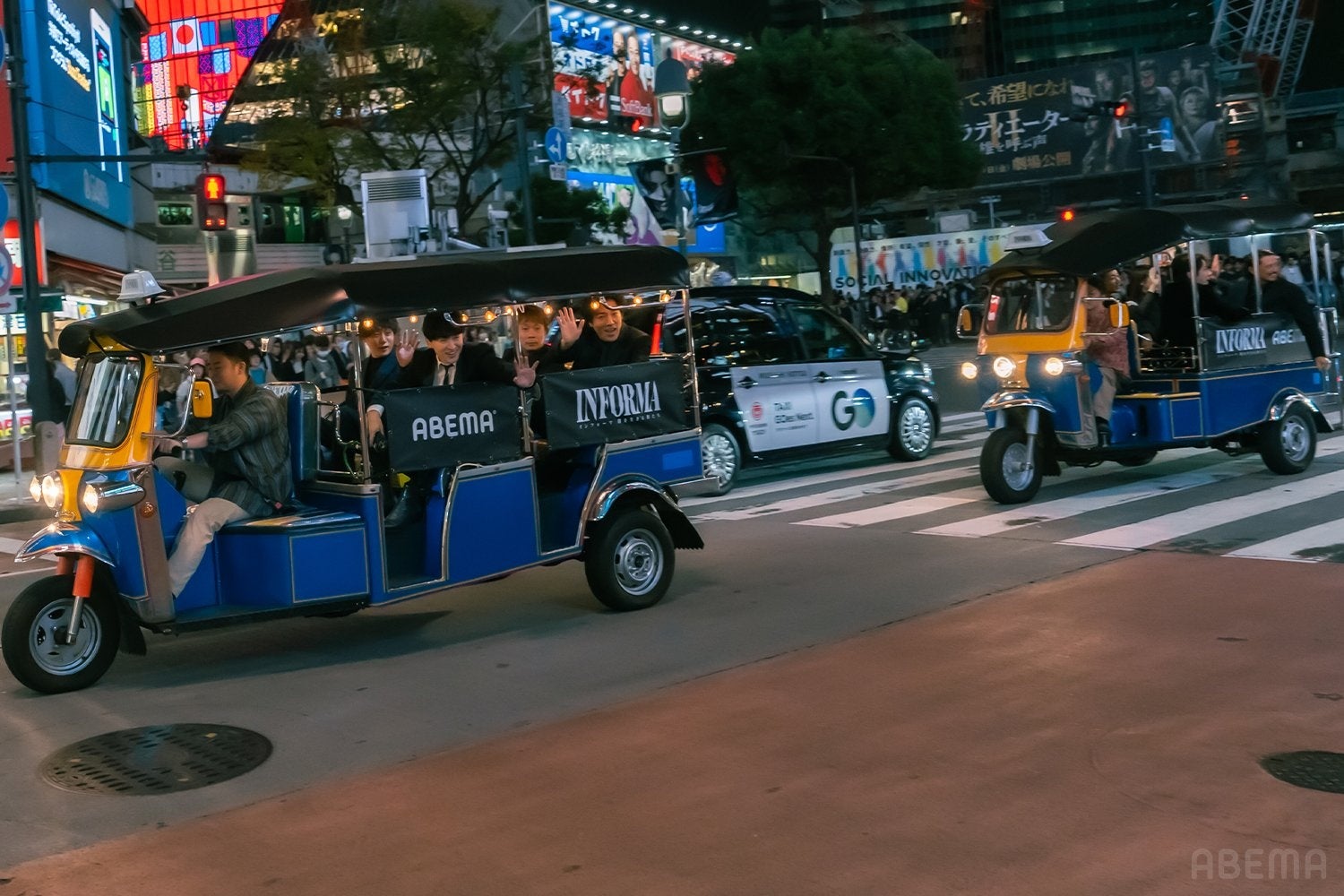 また11月6日(水)に開催された『インフォーマ -闇を生きる獣たち-』放送前日セレモニーの後に、主演の桐谷健太、佐野玲於、莉子、池内博之、二宮和也、そして原作・監修の沖田臥竜、企画・プロデュースの藤井道人、監督・脚本の逢坂元の登壇者8名が、タイでタクシーの役割を果たす乗り物・トゥクトゥクに乗車し、渋谷の街を駆け巡りながらドラマの宣伝を行いました。告知されていなかったこともあり、偶然居合わせた通行人からは「ええ?!」と驚きの声があがり、信号待ちなどで距離が近くなった際には「インフォーマ、見てね〜!」と会話を繰り広げる場面も。桐谷も笑顔で手を振りながら、15分ほどの渋谷周遊を楽しんでいる様子を見せました。