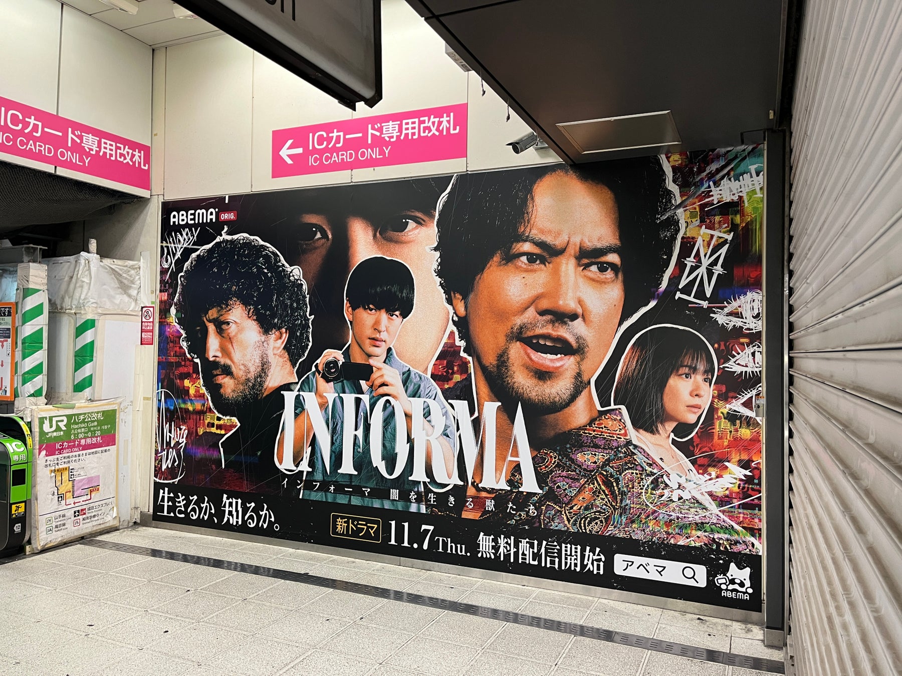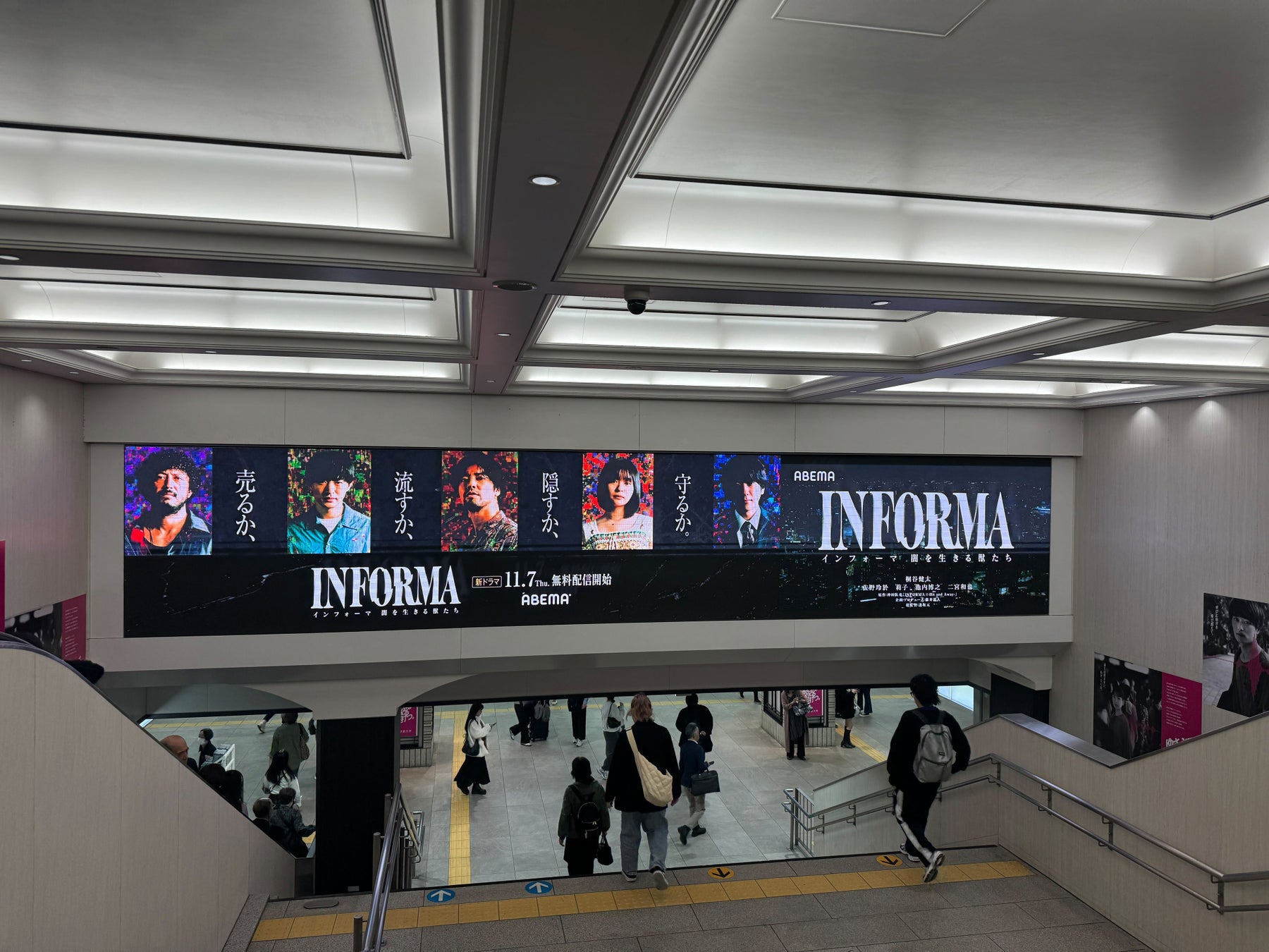 放送開始に伴って、2024年11月2日(土)~11月24日(日)までの期間様々な所に屋外広告を掲出いたします。その中でも、「ルミネエスト新宿 ラウンドボード」や「ヒューマックス パビリオン 新宿アネックス」、「東京メトロ 新宿駅」構内、「JR 渋谷駅」「東急田園都市線 渋谷駅」構内などに掲出された広告では、桐谷健太が演じる謎の情報屋、通称“インフォーマ”・木原慶次郎が通行人を鋭い目つきで見つめながら、「見てるで。」とさもすべての情報を掴まれているかのように語りかけます。