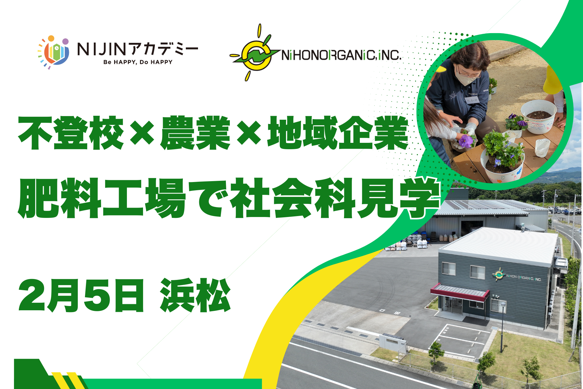 株式会社NIJIN(本社:東京都江東区、代表取締役:星野達郎)が運営する小中一貫オルタナティブスクール「NIJINアカデミー」は、2026年2月5日(木)、静岡県浜松市にて、日本オーガニック株式会社(所在地:静岡県浜松市)のご協力のもと、肥料工場での社会科見学(企業コラボ遠足)を実施します。