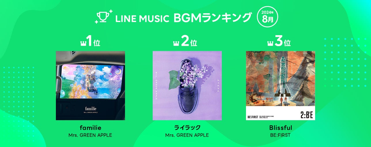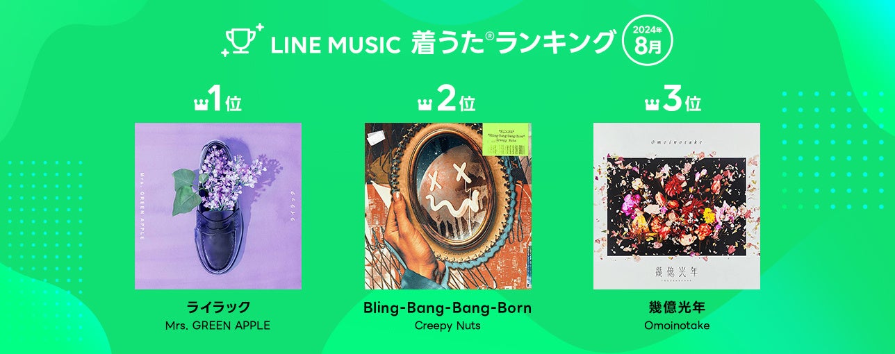 LINE MUSIC株式会社は、当社が運営する音楽ストリーミングサービス「LINE MUSIC」(iPhone・Android対応)の2024年8月の月間ランキングを発表、人気楽曲100曲を集めたプレイリストを公開します。さらに、「LINE MUSIC」独自のロジックで10代が今最も注目している楽曲を10代トレンドランキングとして発表します。