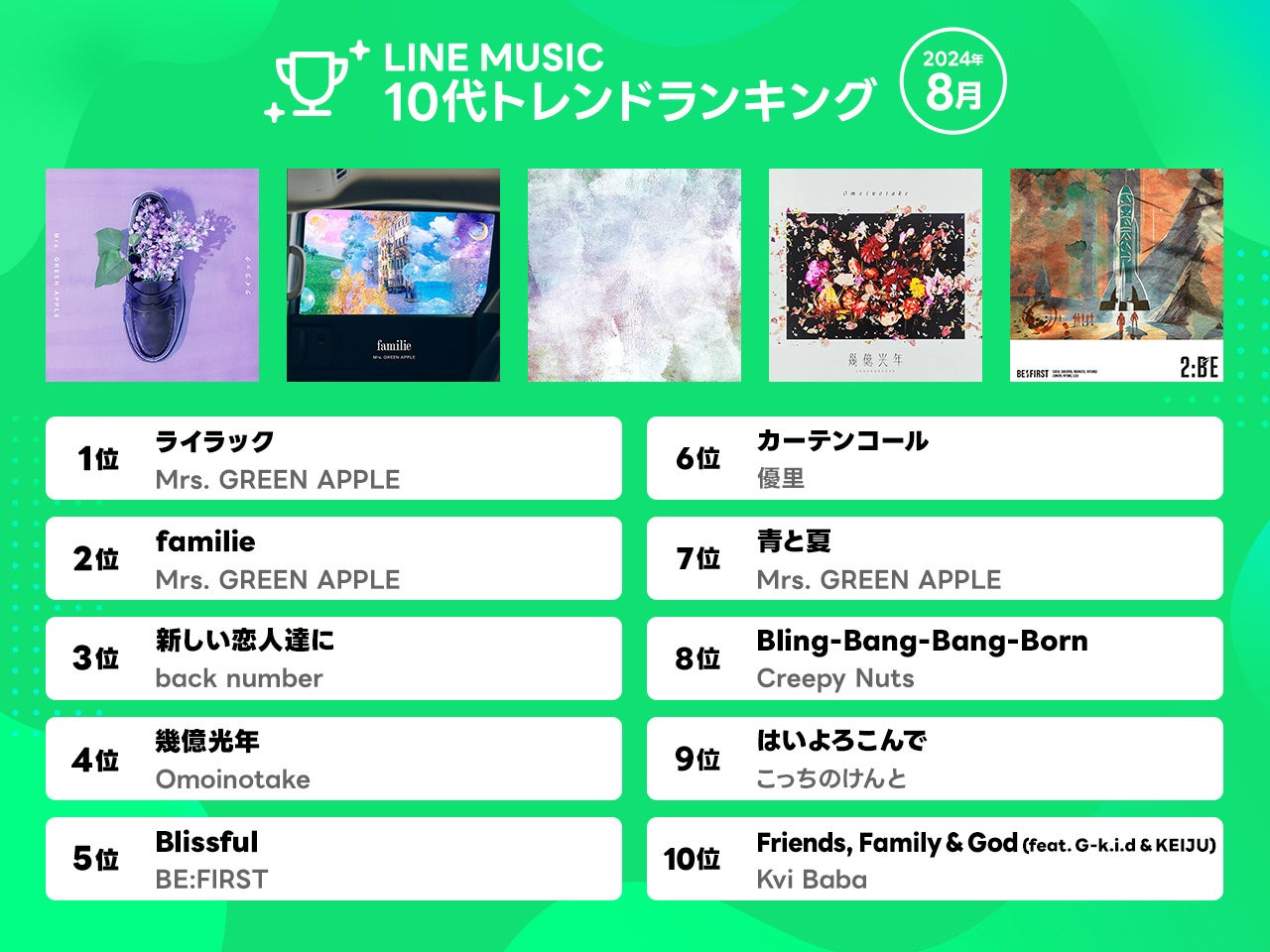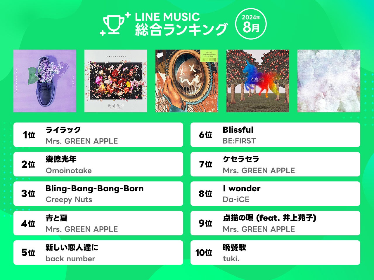 【LINE MUSIC 2024年8月月間ランキング】先月に引き続きMrs. GREEN APPLE「ライラック」が1位を獲得!ミセスはTOP10に4曲がランクインする快挙