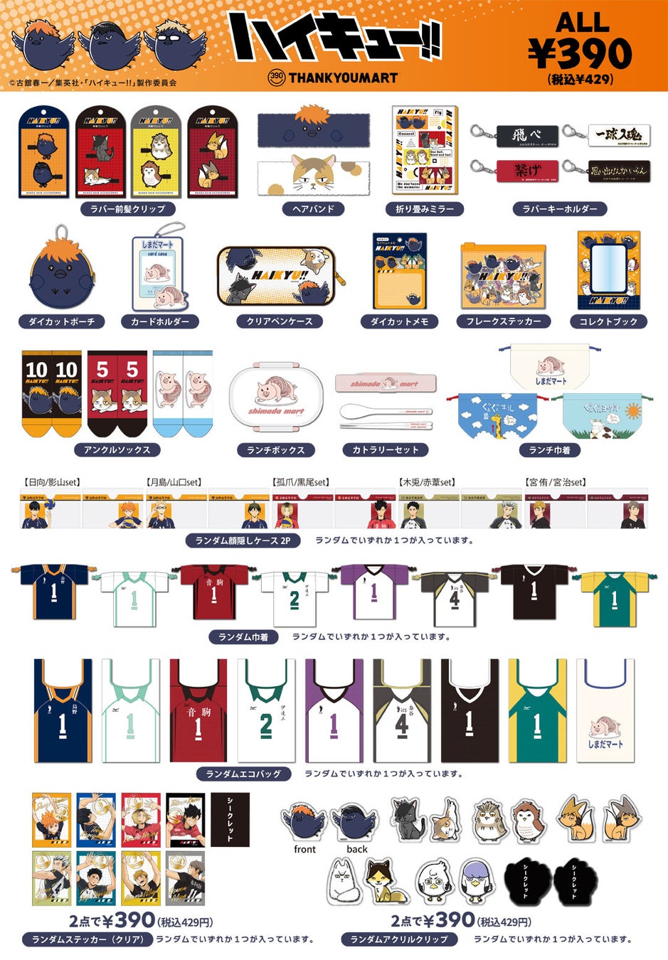 アニメ「ハイキュー!!」の限定アイテムが全品390円(税込429円)でサンキューマートから新発売!ユニフォームデザインや「アニマルマスコット」「しまだマート」の人気モチーフも登場