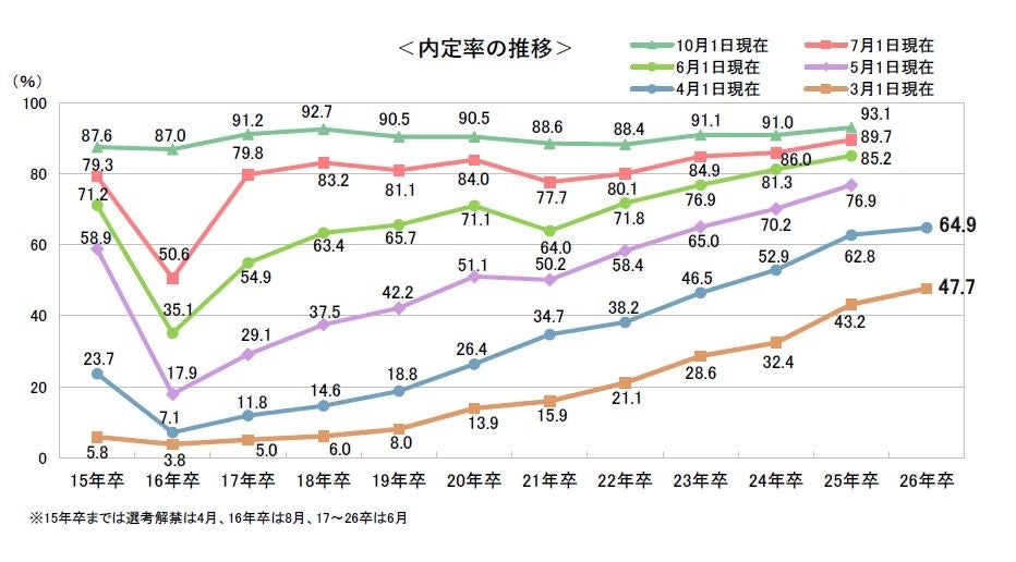 ○内定率は64.9%。前年同期実績(62.8%)を2.1ポイント上回る