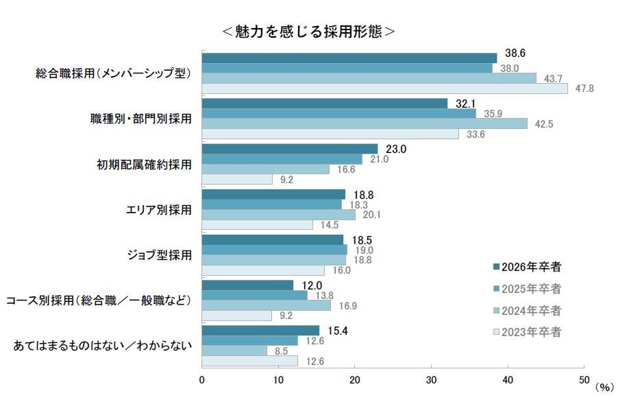 ○「総合職採用(メンバーシップ型)」が最多。「初期配属確約採用」は増加傾向