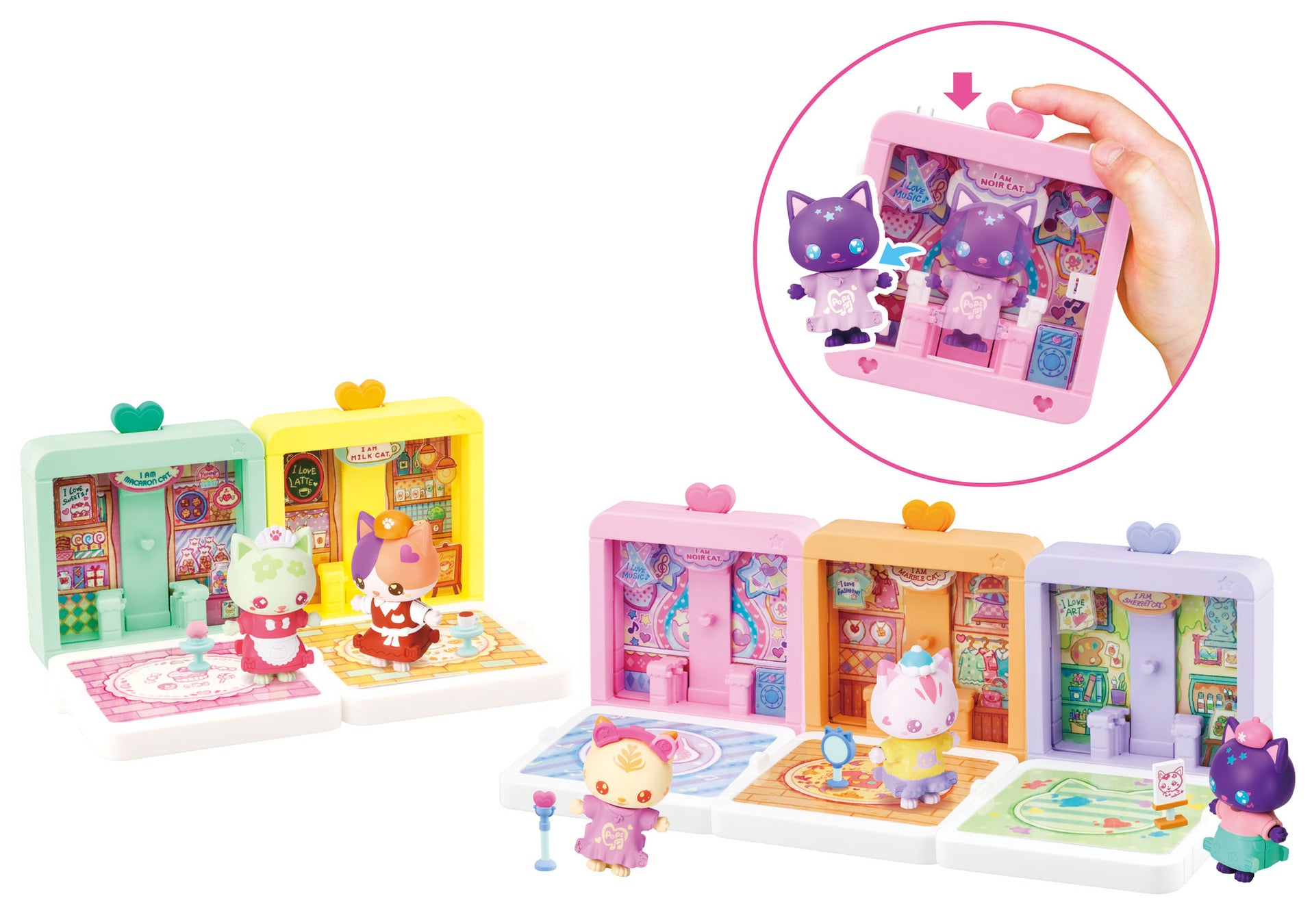 『スナップフレンズ』は、「着せ替え遊び」と「ドールハウス遊び」が楽しめるねこのドールシリーズです。「着せ替え遊び」は、服とドールをセットしたフレームを3枚重ねてフレーム上にあるハートをプッシュすることでドールが服を着て、ポンとフレームから外れます。ドールに、ヘッドホンなどのアクセサリーをつけてお着替え完了です。1商品に2つの服が入っています。「ドールハウス遊び」は、お着替えに使ったフレーム本体を組み立ててドールとマイクなどの小物をおいてハウスを完成させ、お人形遊びができます。ハウスは連結可能で、集めればタウンが広がります。これまでにない不思議なギミックでのお着替えとおなじみのドールハウス遊び両方が楽しめます。