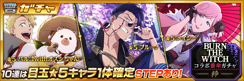 「BURN THE WITCHコラボ番傘ガチャ―粋―」は、STEP25まで5STEP毎に目玉★5キャラクター1体が確定!