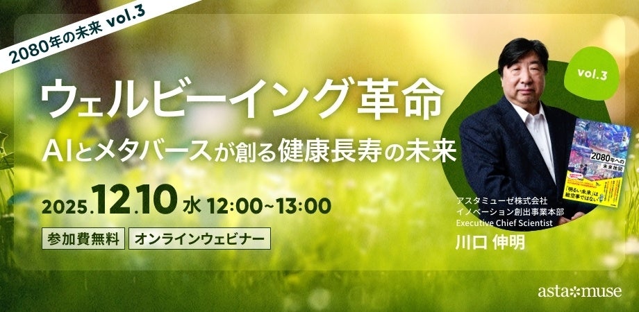 アスタミューゼ株式会社(本社:東京都千代田区、代表取締役社長 永井歩)は、2025年12月10日(水)12:00-13:00に、『2060 未来創造の白地図』および『2080年への未来地図』著者、弊社のExecutive Chief Scientistである川口伸明による無料ウェビナー「ウェルビーイング革命:AIとメタバースが創る健康長寿の未来~2080年の未来シリーズvol.3~」を開催いたします。書籍に取り上げた技術領域や社会課題、未来世界について語るウェビナーです。