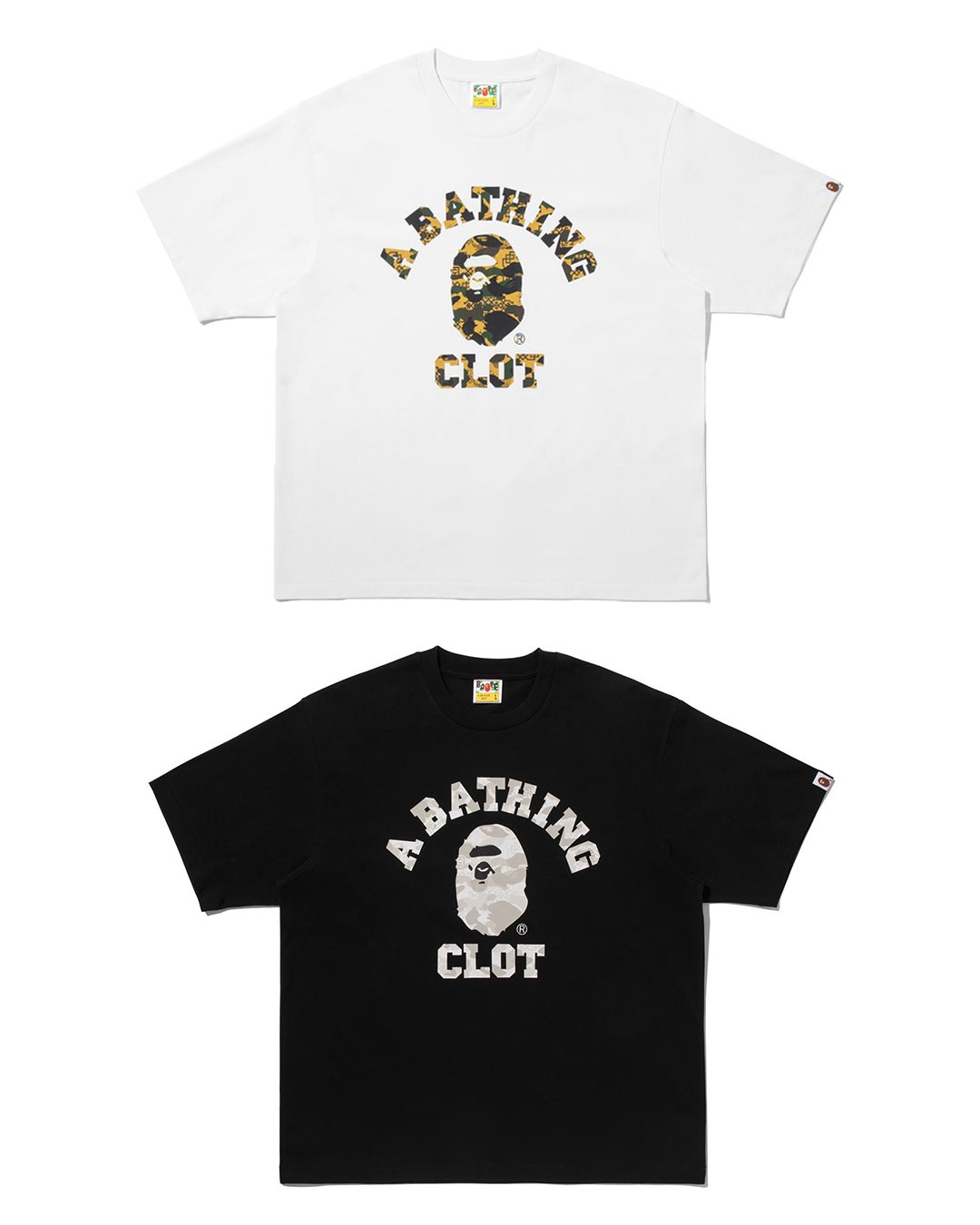 リラックスフィットのTシャツは、クリーンなデザインが特徴。カレッジテイストのグラフィックをベースに、コラボレーションならではのカモパターンとCLOTのロゴを組み合わせ、BAPE®のルーツであるストリートカルチャーへのオマージュを表現しています。