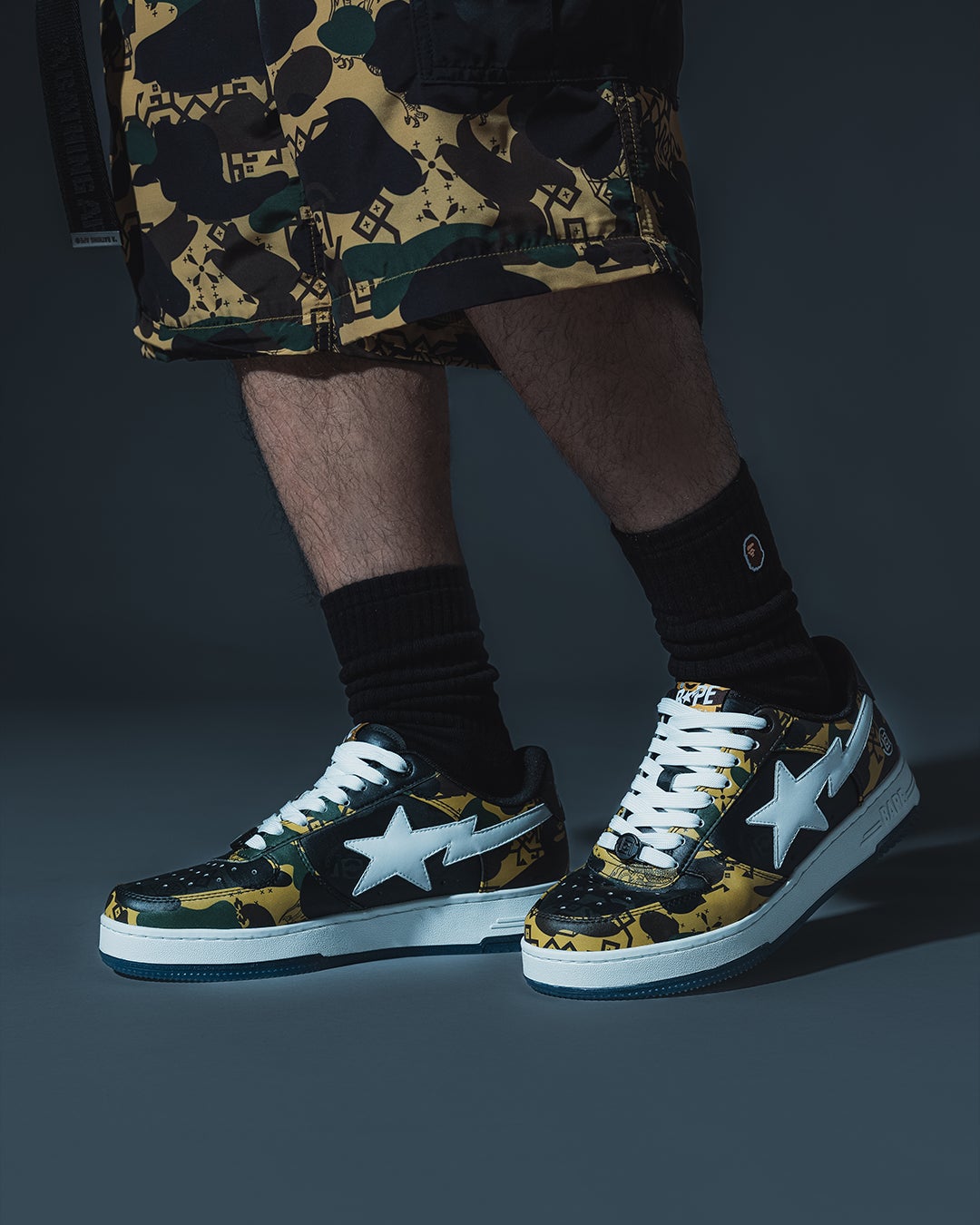 BAPE®の定番スニーカー「BAPE STA™」も、コラボレーション仕様にアップデート。アッパーには特別なカモ柄を採用し、アウトソールにはシャークとドラゴンのグラフィックを透過プリントで表現。