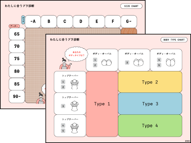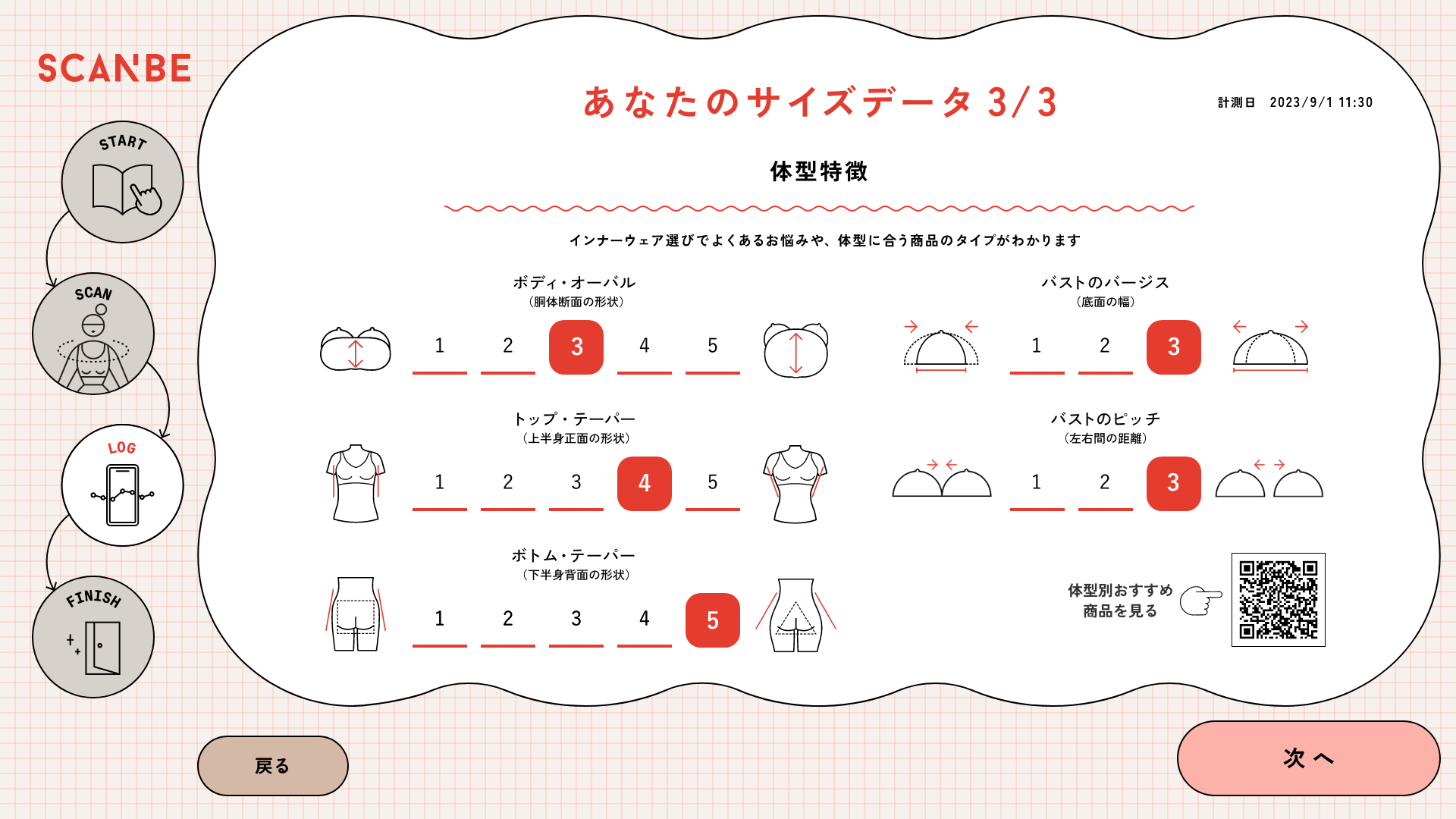 「SCANBE」で計測した3Dボディデータを活用し、ボディタイプを診断(全8タイプ)。サイズだけではわからない、お客さまのからだに合ったブラジャーの選び方を10分でご案内します。