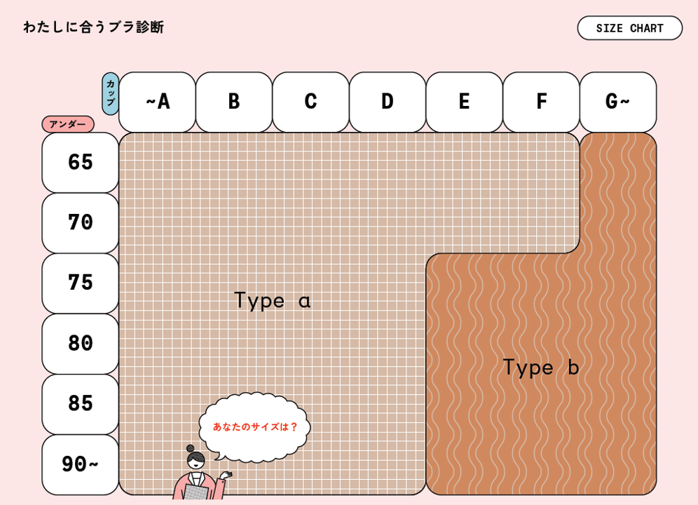 60年以上に及び約45,000人のからだの計測をしてきたワコール人間科学研究開発センターの研究データより、からだにフィットするブラジャーを選ぶには「サイズ」の他に「ご自身の体型にあっているか」が大切なポイントということがわかっています。店舗では販売員による接客や、試着を通してご自身の体型に合うブラジャーを探すことができますが、EC上にてお客さまご自身で判断いただくことはハードルが高く、ECでの下着購入に不安を感じる方も多いと考えられます。(※3)