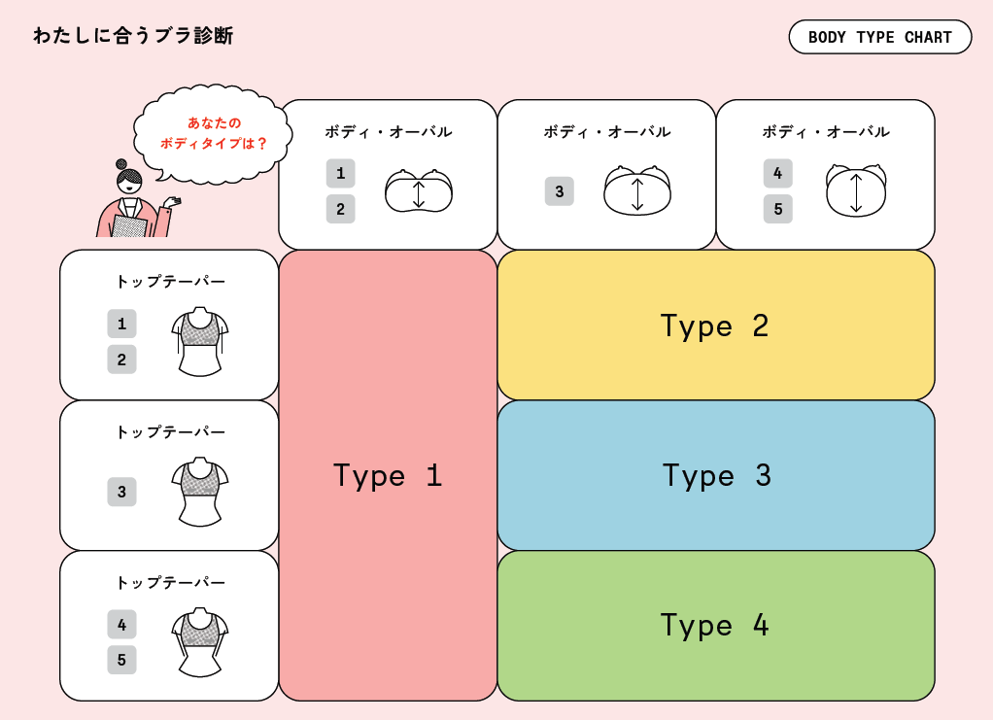 「ワコールウェブストア」にて3~6問の簡単な質問に回答いただき、お客さまの推定ボディタイプを判定します。