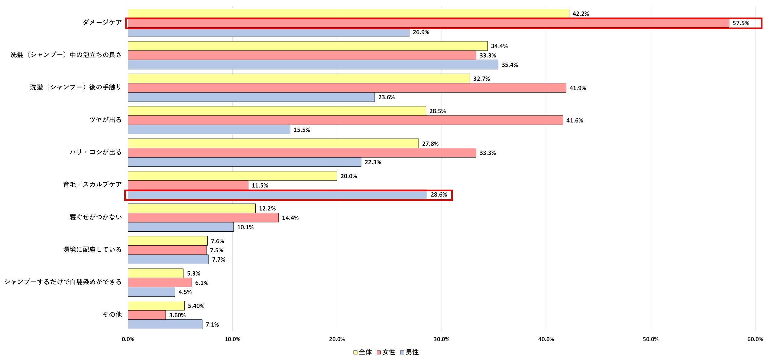この回答を男女別に見ると、女性は6割近い方が「ダメージケア」(57.5%)と回答しました。続いて、「洗髪(シャンプー)後の手触り」(41.9%)、「ツヤが出る」(41.6%)と回答した人の割合が多い結果となりました。一方、男性は「洗髪(シャンプー)中の泡立ちの良さ」が35.4%で最も高い結果となりました。また、「育毛/スカルプケア」と回答した割合が28.6%で、女性の11.5%と比較すると、15%以上も高い結果となりました。