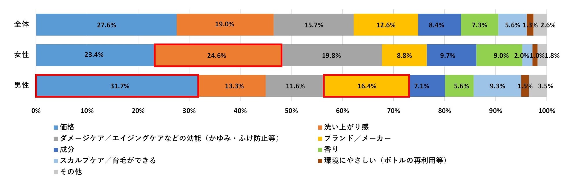 この回答を男女別に見ると、女性では「価格」(23.4%)よりも「洗い上がり感」(24.6%)が最も高い結果となりました。また、「ダメージケア/エイジングケアなどの効能」(19.8%)も高い割合となったことから、女性はシャンプーを価格だけでなく仕上がりや効能も重視する傾向があることがうかがえます。