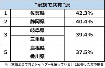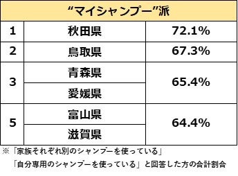上記の質問において、47都道府県別の結果を見てみると、「家族全員で同じシャンプーを使っている」と回答した割合の高い“家族で共有”派となったのは、42.3%で佐賀県という結果となりました。次いで2位が静岡県(40.4%)、3位に岐阜県、三重県(39.4%)が続きました。一方、「家族それぞれ別のシャンプーを使っている」「自分専用のシャンプーを使っている」と回答した方の合計割合が高い、“マイシャンプー化”傾向が強かった県は、72.1%で秋田県という結果になりました。秋田では、約7割以上の方が、シャンプーを使い分けていることが明らかになりました。