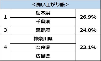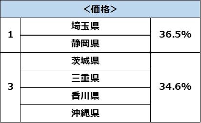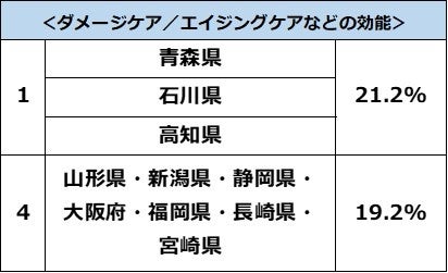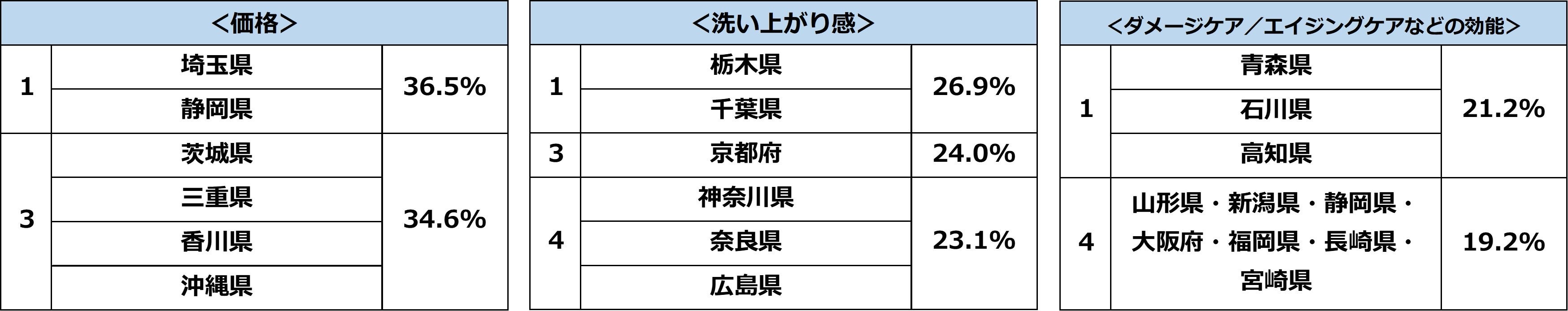 また、重視するポイントとして回答率の高かった「価格」「洗い上がり感」「ダメージケア/エイジングケアなどの効能」の項目について、47都道府県別に結果をランキングしました。「価格」の割合が最も高かったのは埼玉県、静岡県で36.5%と、全体平均よりも約9%高い結果となりました。続いて、2位となった「洗い上がり感」では、26.9%で栃木県と千葉県がトップとなりました。神奈川県(23.1%)も4位に入っていることから、関東エリアの県が上位にランクインしました。最後に「ダメージケア/エイジングケアなどの効能」では、青森県、石川県、高知県が21.2%でトップとなりました。