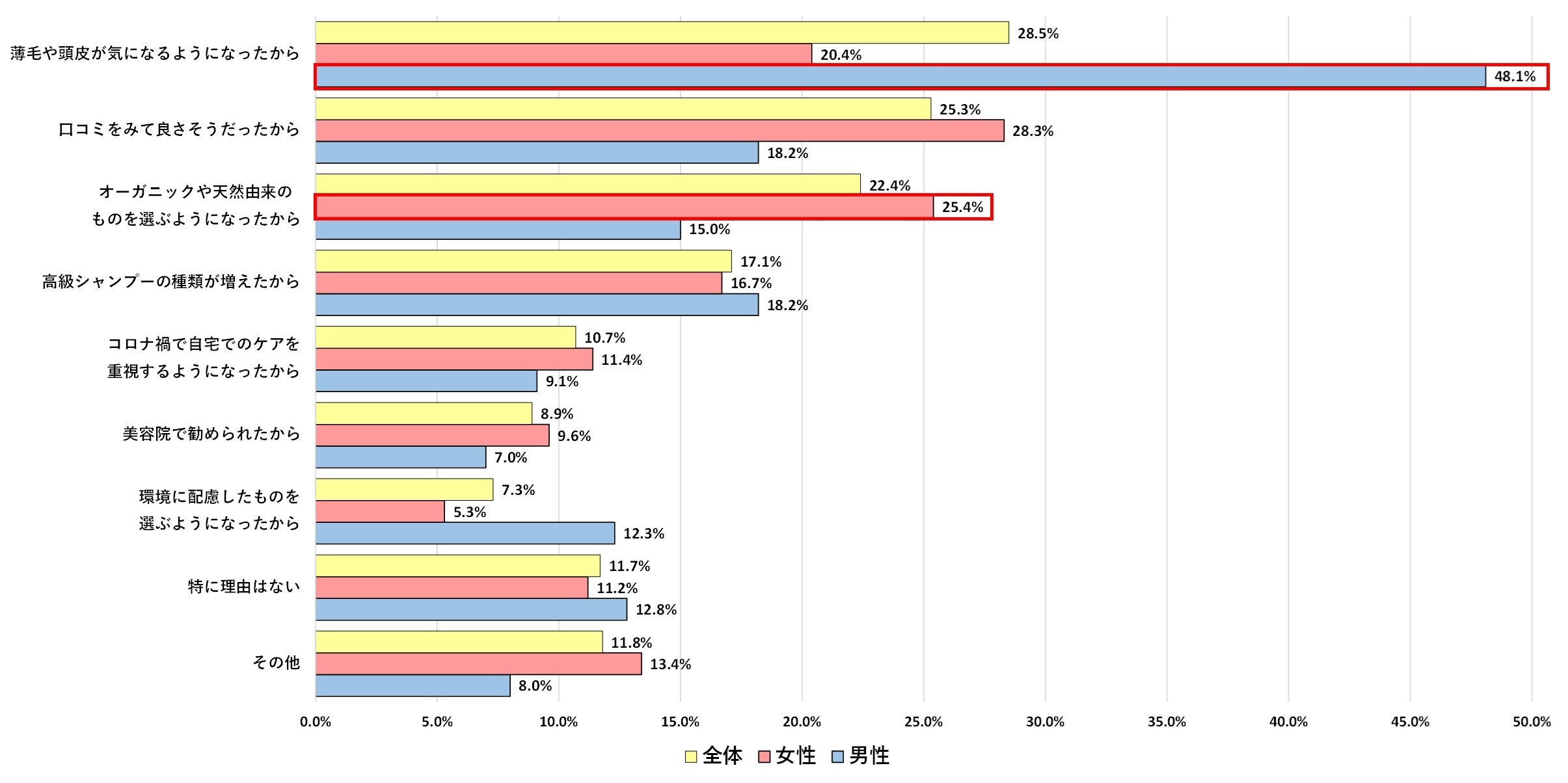 上記の質問において、「高くなった」と回答した人にそのきっかけを尋ねたところ、全体では「薄毛や頭皮が気になるようになったから」が28.5%でトップになりました。この傾向は特に男性の方が高く、48.1%と女性よりも約30%近い差がつく結果となりました。続いて、「口コミをみて良さそうだったから」が25.3%で2位に入りました。