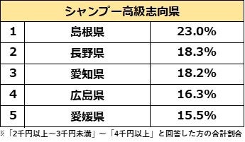 上記の質問において、47都道府県別の結果を見てみると、「1千円未満」と回答した人の割合が高かったのは宮城県と沖縄県という結果になりました。どちらの県も77.9%と約8割近い人が「1千円未満」と回答しており、シャンプーへの節約意識が高い傾向が見られます。一方、「2千円以上~3千円未満」~「4千円以上」の選択肢を回答した人の合計割合が高かった高級志向な県を見てみると、1位は島根県で23.0%という結果になり、2割以上の方が2千円以上のシャンプーを使用していることが分かりました。次いで、長野県(18.3%)、愛知県(18.2%)が続く結果となっています。
