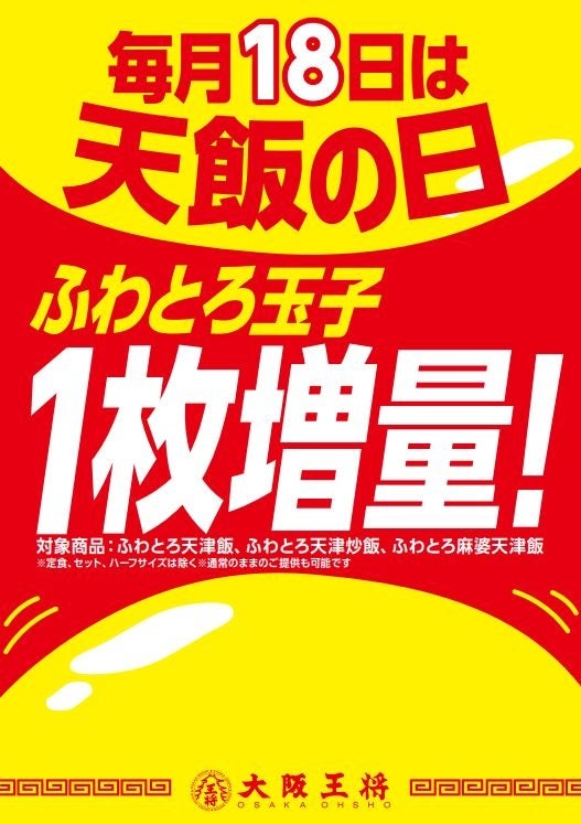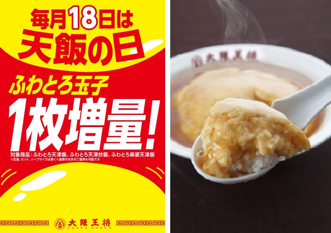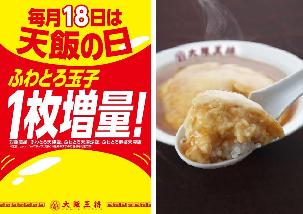 毎月18日は、大阪王将で根強い人気を誇る、ふわとろ天津飯、ふわとろ天津炒飯、ふわとろ麻婆天津飯の「ふわとろ玉子」が1枚増量になるキャンペーンを実施中。毎月1回の特別な日です。