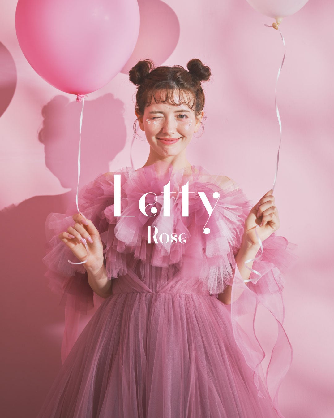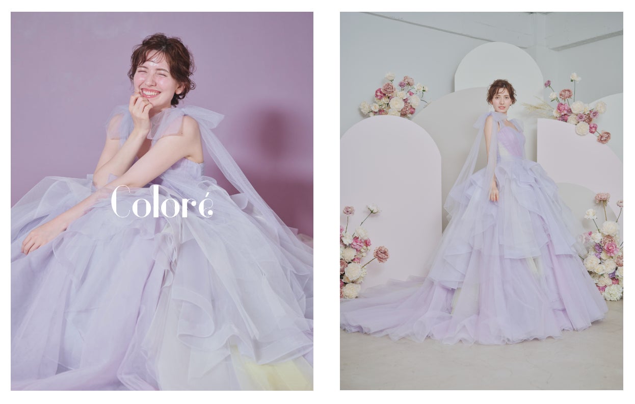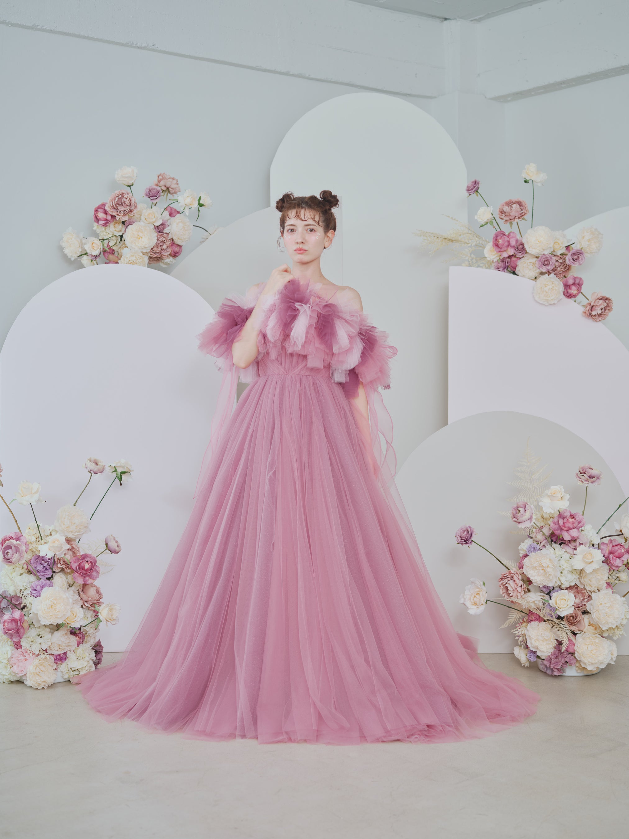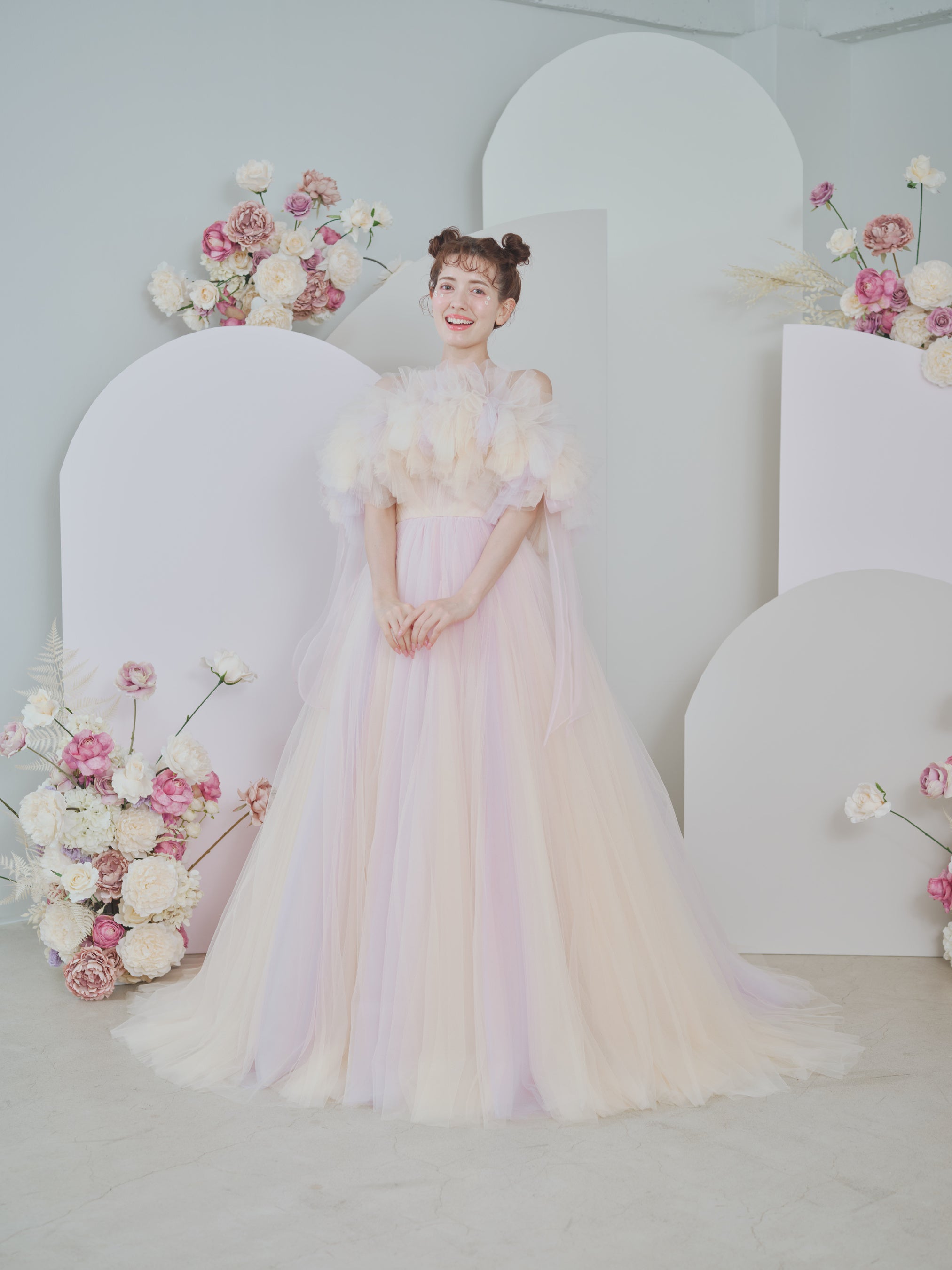 パープル、イエロー、ホワイトのソフトチュールを絶妙なバランスで重ね、ニュアンスのある色合いに仕上げた1着。 肩から流れ落ちるようなリボンとランダムなティアードスカートが 花嫁の動きに合わせて軽やかに揺れ、360度どこから見ても魅力的な姿に。