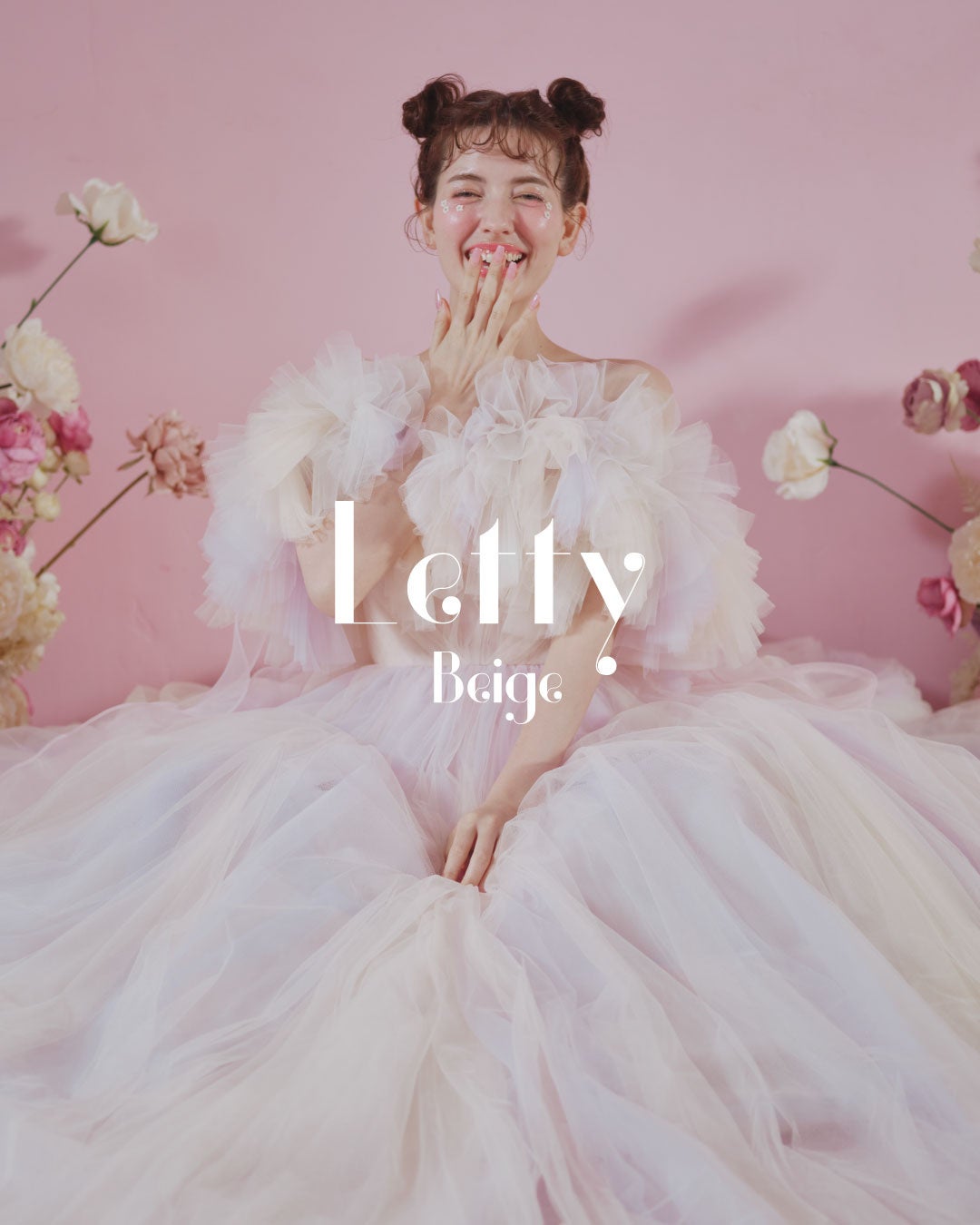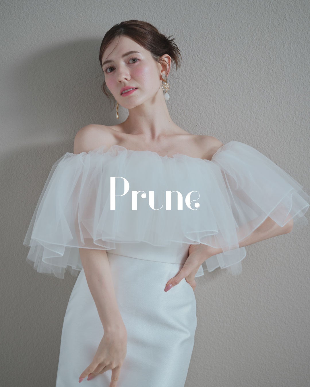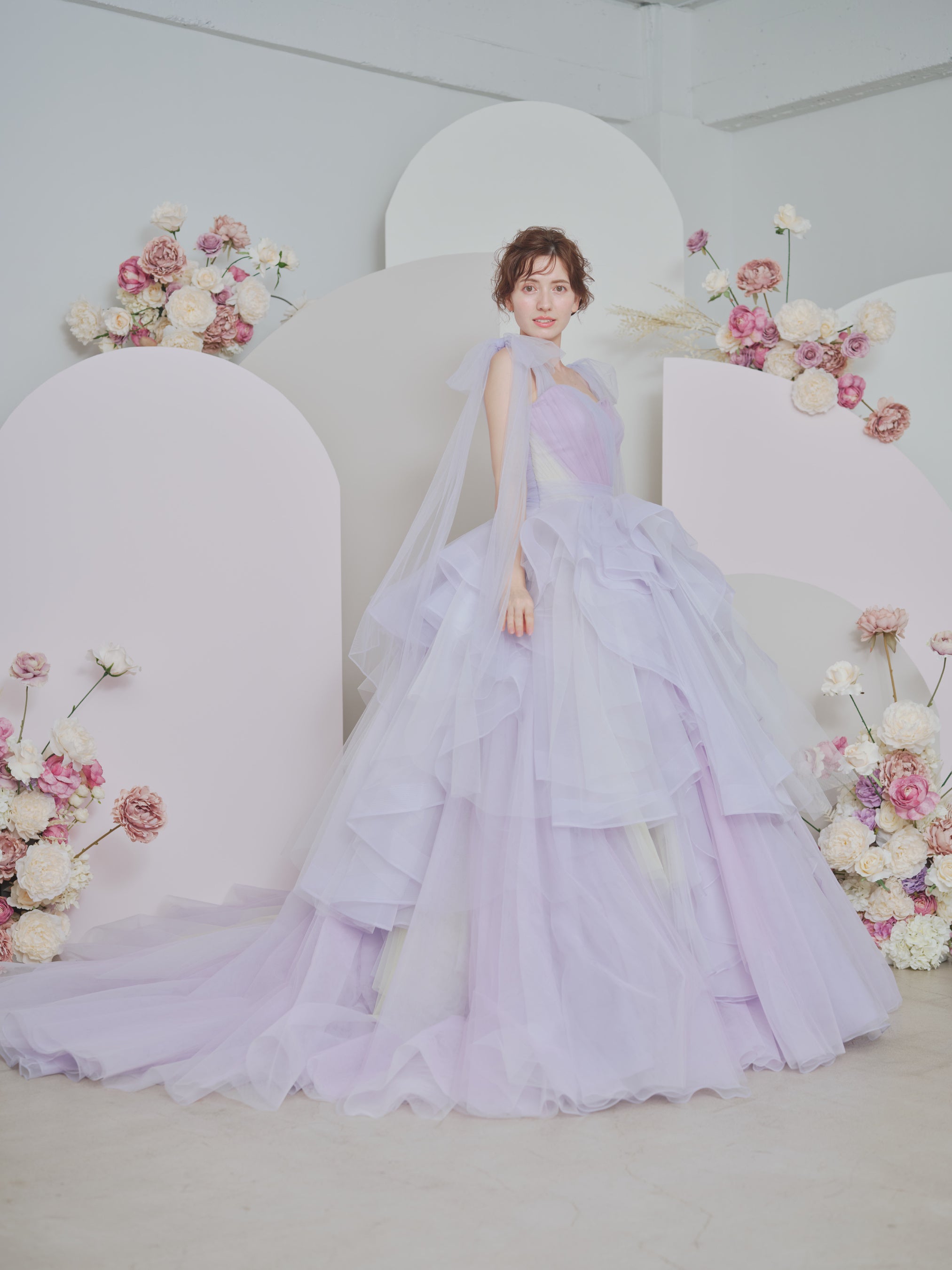 淡いベージュとパープルのソフトチュールを重ねて 大人の可愛らしさを表現しつつ、洗練されたパターンで仕上げたドレス。 包まれるような心地良さのフリルショールがフォトジェニックで、トレンド感たっぷりの1着。