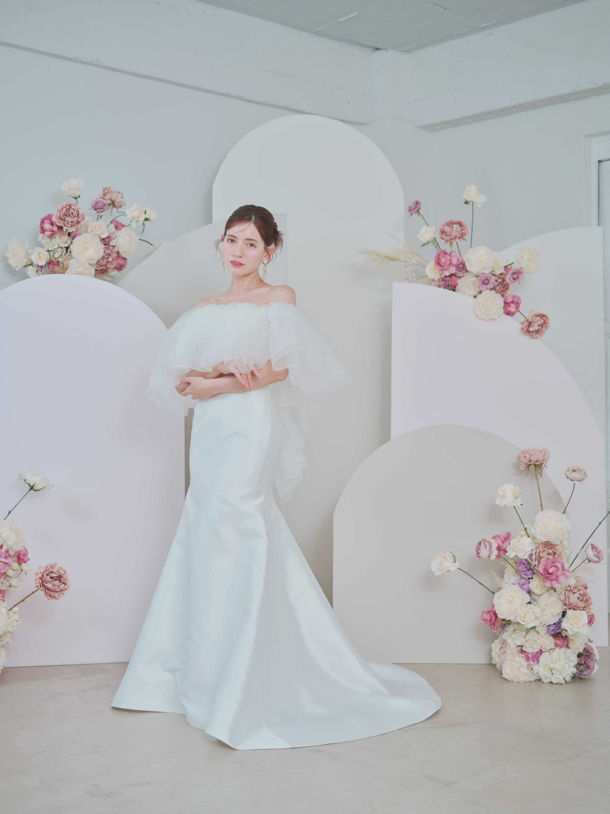 ミカド素材を使用した、美しいシルエットのマーメイドラインが優美な印象を与えてくれるウエディングドレス。 光沢感のあるミカド素材と柔らかなチュールのショルダーとの異素材の組み合わせがモードな印象をより一層引き立ててくれる1着です。