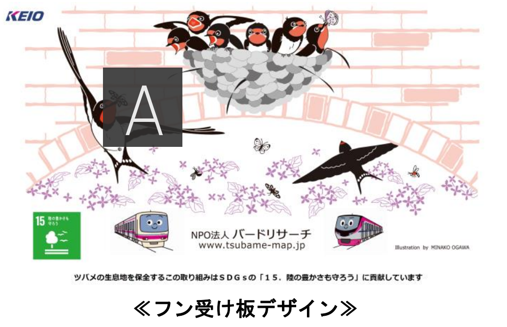フン受け板にはツバメが子育てをする時期に咲くムラサキハナナと可愛らしいツバメ達、京王電鉄キャラクターけい太くんと京王線5000系キャラクターのしんごくんが描かれています。
