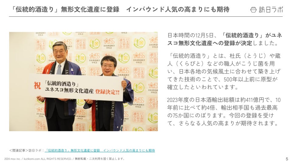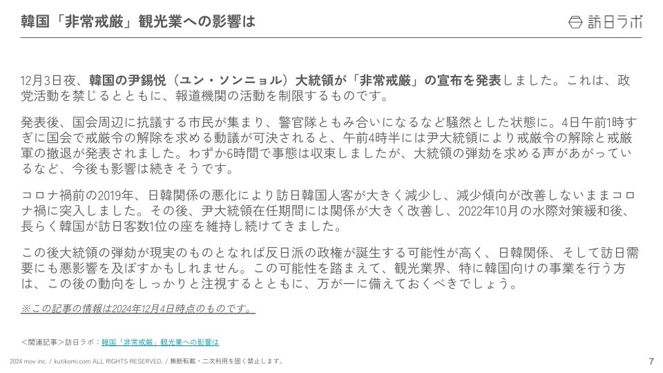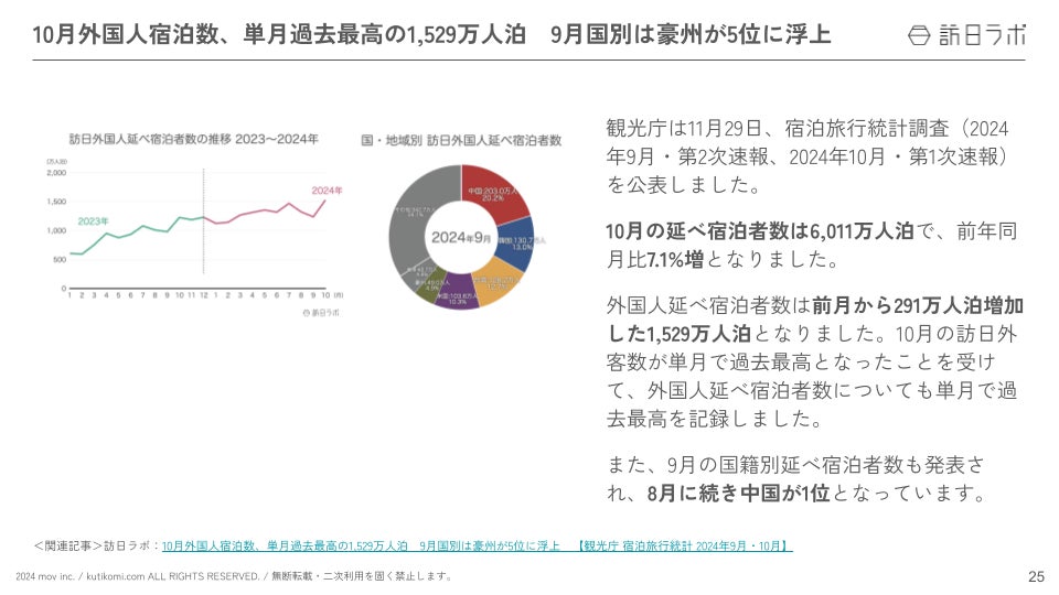 業界最大級のインバウンドビジネスメディア「訪日ラボ」及び 店舗向け集客一元化プラットフォーム「口コミコム」を運営する株式会社mov(代表取締役:渡邊 誠、本社:東京都渋谷区、以下mov)は、「インバウンドに関する最新トレンド・データ」「政府・自治体・企業などのインバウンド関連の取り組み」をはじめ、インバウンド対策に役立つニュースをまとめた「インバウンド情報まとめ【2024年12月前編】」を公開しました。