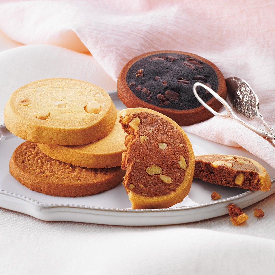 バターの風味を存分に楽しめる、大きめサイズのクッキー。香り高い醗酵バターなど厳選した素材を使ってさくさくの食感に仕上げました。 [プレーン]、[マカダミア]、[ウォルナッツ]、[ココナッツ]、[チョコチャンク]の5種類の味わいを気軽に楽しめる、5枚入の詰め合わせです。