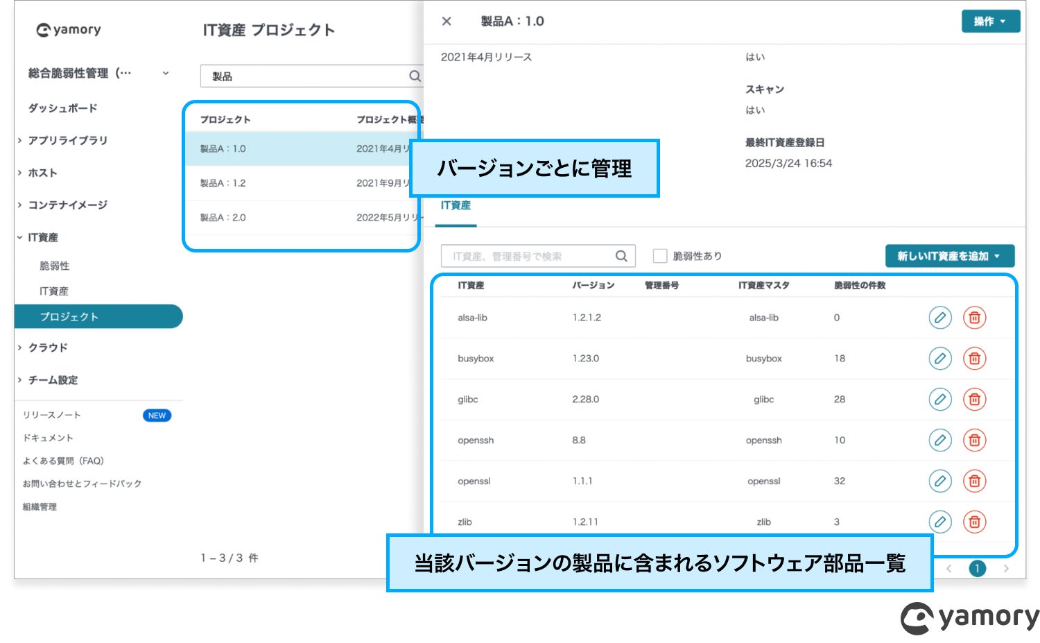 当社が提供する製品は、発売時期によって様々なバージョンが存在しており、製品およびバージョンごとの管理が非常に複雑でした。全てのバージョンをyamoryに登録する、という方法もありますが、それだと全てのバージョンに共通するコンポーネントに脆弱性が発見された場合、全てのバージョンに対応を記載しなければならず、費用もかさみます。IT資産登録機能により、製品ごとにプロジェクトを分けて管理することで、わかりやすく世代管理と脆弱性管理を両立することができると考えています。