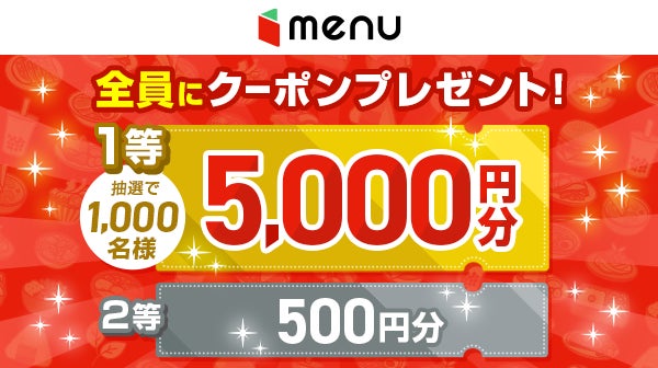 3/28(月) 10:00 ~ 4/1(金) 09:59 - フードデリバリー『menu』で使える!1等5,000円分クーポン当たる!