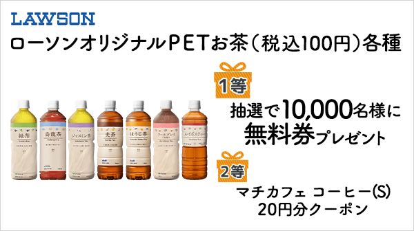 3/28(月) 10:00 ~ 4/3(日) 23:59 - 『ローソンオリジナルPETお茶(税込100円)各種』を10,000名様にプレゼント