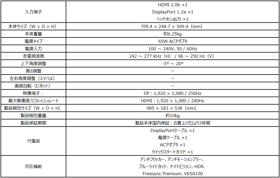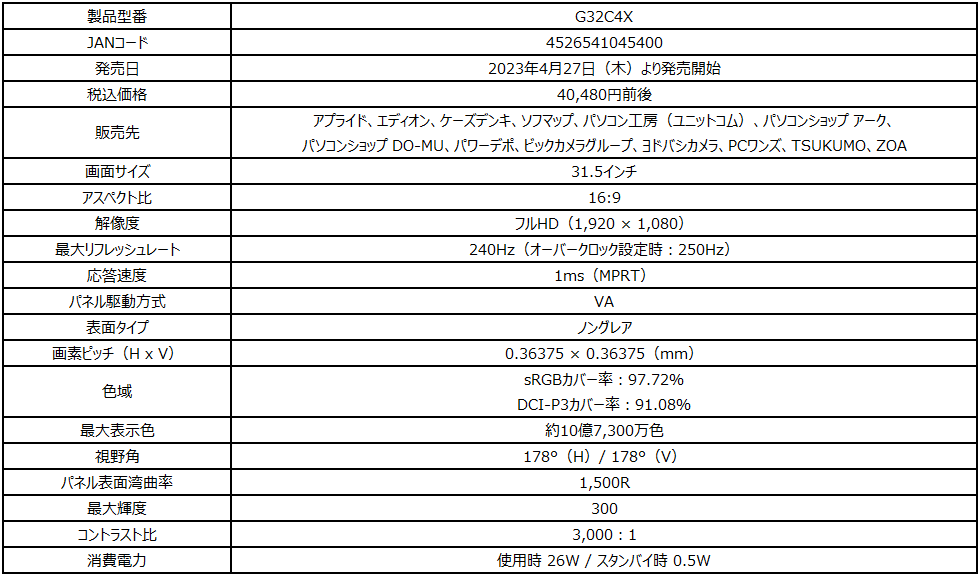 「G32C4X」は肉眼に近い湾曲率1,500Rで高い没入感を体験でき、細かな箇所も見やすい31.5インチサイズのフルHD(1,920 × 1,080)解像度、競技性の高いゲームでより実用的なリフレッシュレート250Hz(オーバークロック設定)、応答速度1msの高いスペックを誇り、残像感の少ない映像で快適にゲームプレイを楽しむことが出来ます。さらに、同期機能としてFreeSync Premium、リアルな映像を表現可能なHDR、暗いシーンでも視認性を上げるナイトビジョン、長時間の使用において目の疲労を軽減するアンチフリッカー、ブルーライトカット機能を搭載しており、手頃な価格帯でより高いリフレッシュレートを求めるゲーマーにお勧めのモデルです。入力端子はHDMI 2.0b ×2、DisplayPort 1.2a ×1に対応しており、パソコンとゲーム機など複数の機器を接続し、背面のジョイスティックを操作することで簡単に切り替えて使用することができます。さらに、VESA規格対応でモニターアームに取り付け、机の上のスペースを有効活用する事が可能です。