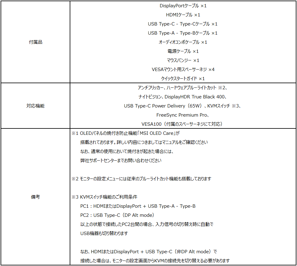 この度、エムエスアイコンピュータージャパン株式会社は2023年4月27日(木)よりゲーミング向けモニターの新モデルを発売いたします。圧倒的な性能と豊富な機能を兼ね備えたハイエンドゲーミングモニターブランド『MEG』シリーズより、MSI初となるQD-OLEDパネルを搭載し、34.18インチのUWQHD解像度、リフレッシュレート175Hz、応答速度0.1ms(GTG)と従来のモニターは比較にならないほどの圧倒的な映像表現とゲーミング性能を備え、UDB PD 65WやKVMスイッチ等の豊富な機能を兼ね備えた「MEG 342C QD-OLED」が新たにラインナップに加わります。