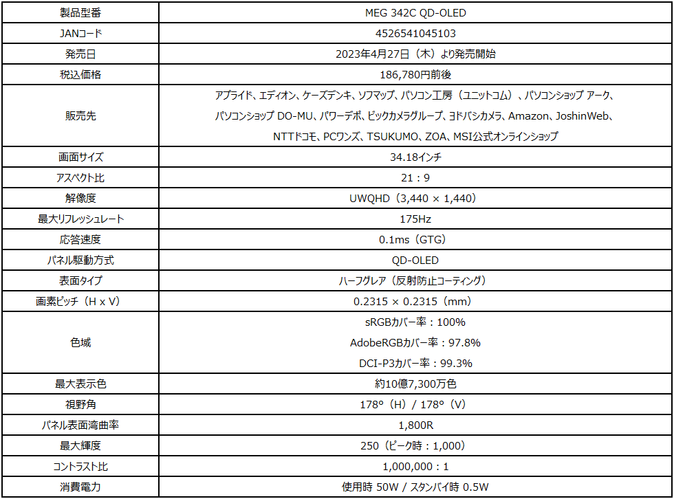 MSI初のQD-OLEDパネル搭載、超高画質湾曲ゲーミングモニター 34.18インチのUWQHD解像度で、応答速度0.1ms(GTG) 「MEG 342C QD-OLED」発売